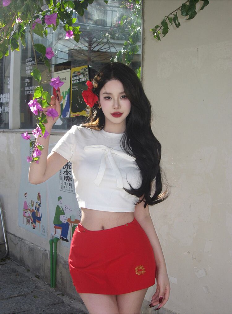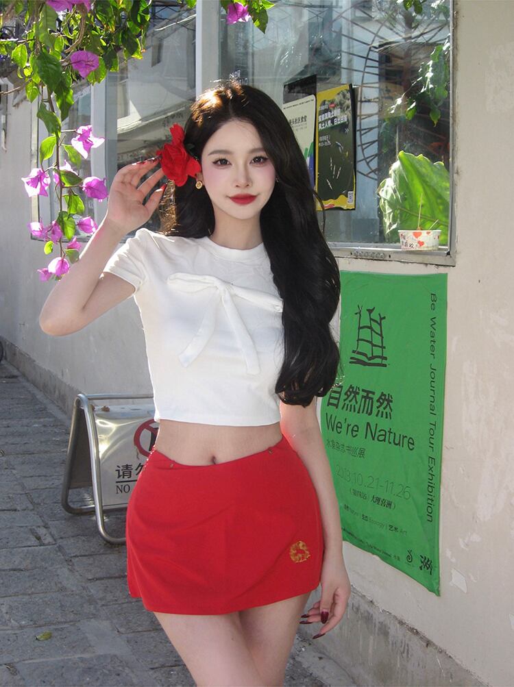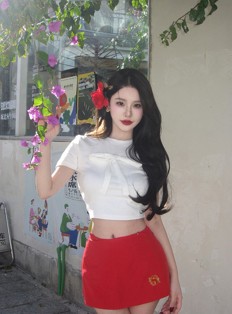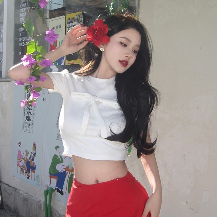 トップス Tシャツ カットソー 袖あり 半袖 クロップ丈 ショート丈 タイト リボン クルーネック スリム ストレート 伸縮性 きれいめ シンプル カジュアル クラシカル 大人 おしゃれ お洒落 大人可愛い 大人女子 こなれ感 無地 春 夏 10代 20代 30代 40代 レディース 女性用 オフィス OL 通勤 学生 通学 デート お出かけ お泊まり 休日 アウトドア 旅行 着回し 普段使い ワンサイズ ホワイト