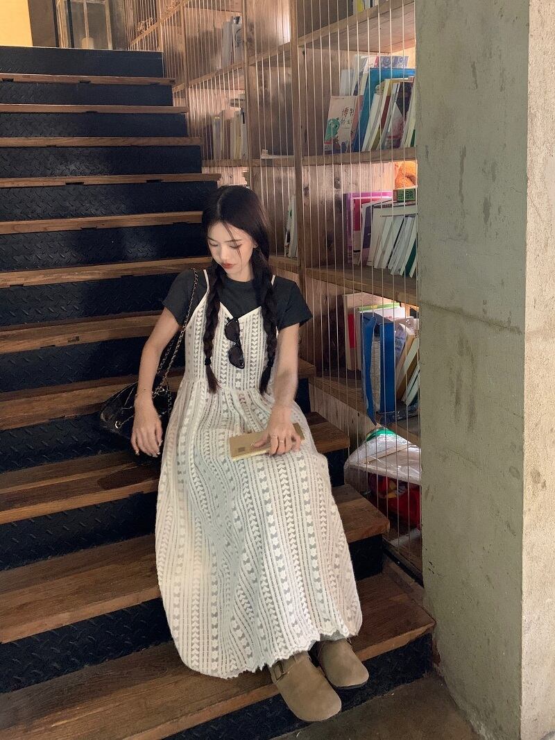 上品な総レースの透け感がきれいなミモレ丈のキャミソールワンピースと