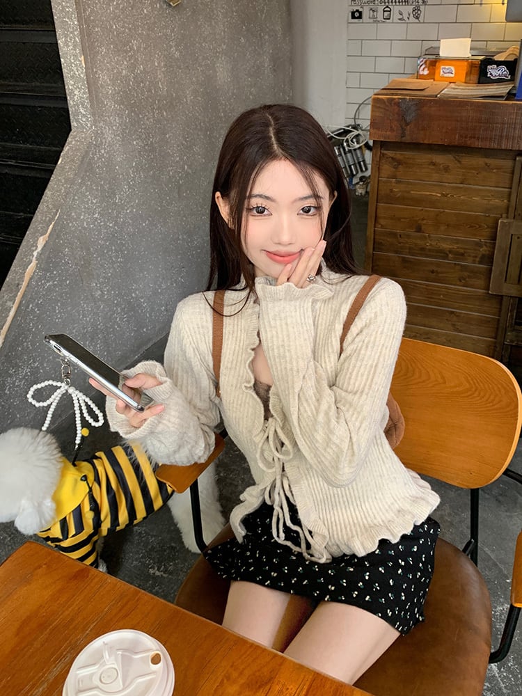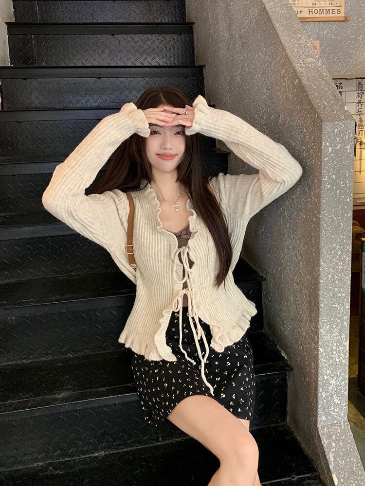 トップス カーディガン ショート丈 袖あり 長袖 Vネック メロウ リボン リブ ドロップショルダー 襟なし スリム 細身 レース フリル かわいい 大人可愛い きれいめ シンプル カジュアル 大人 上品 お洒落 大人女子 こなれ感 ガーリー 主役級 とろみ感 抜け感 無地 春 秋 冬 20代 30代 40代 ママ 通勤 学生 通学 デート お出かけ 女子会 休日 旅行 着回し 普段使い 重ね着 韓国系 オルチャン モテ 定番 トレンド 流行 インスタ映え S M アプリコット