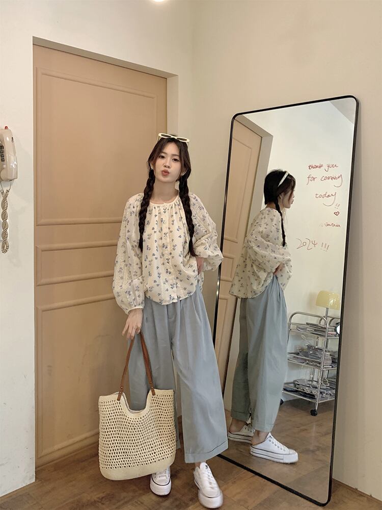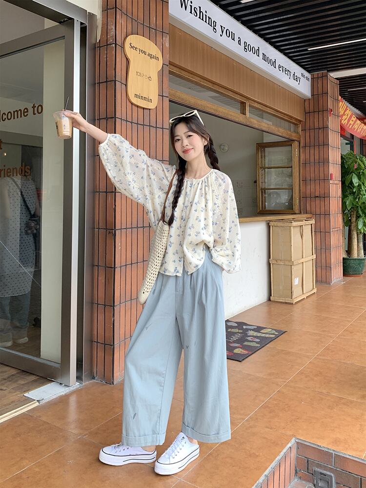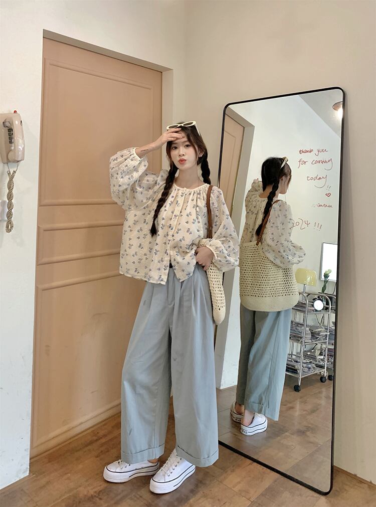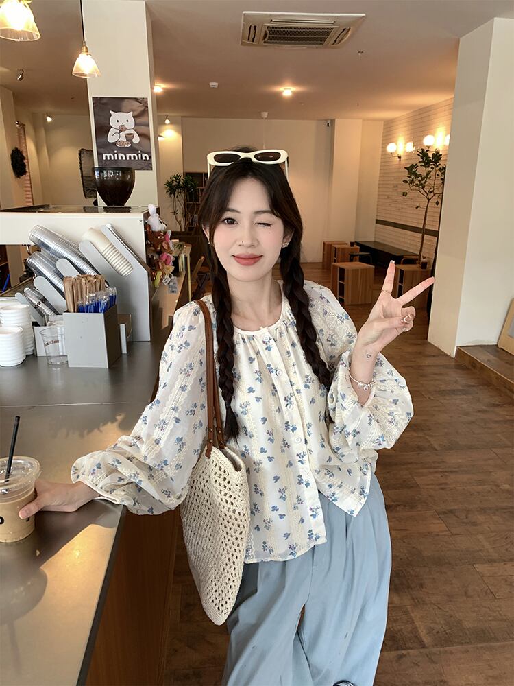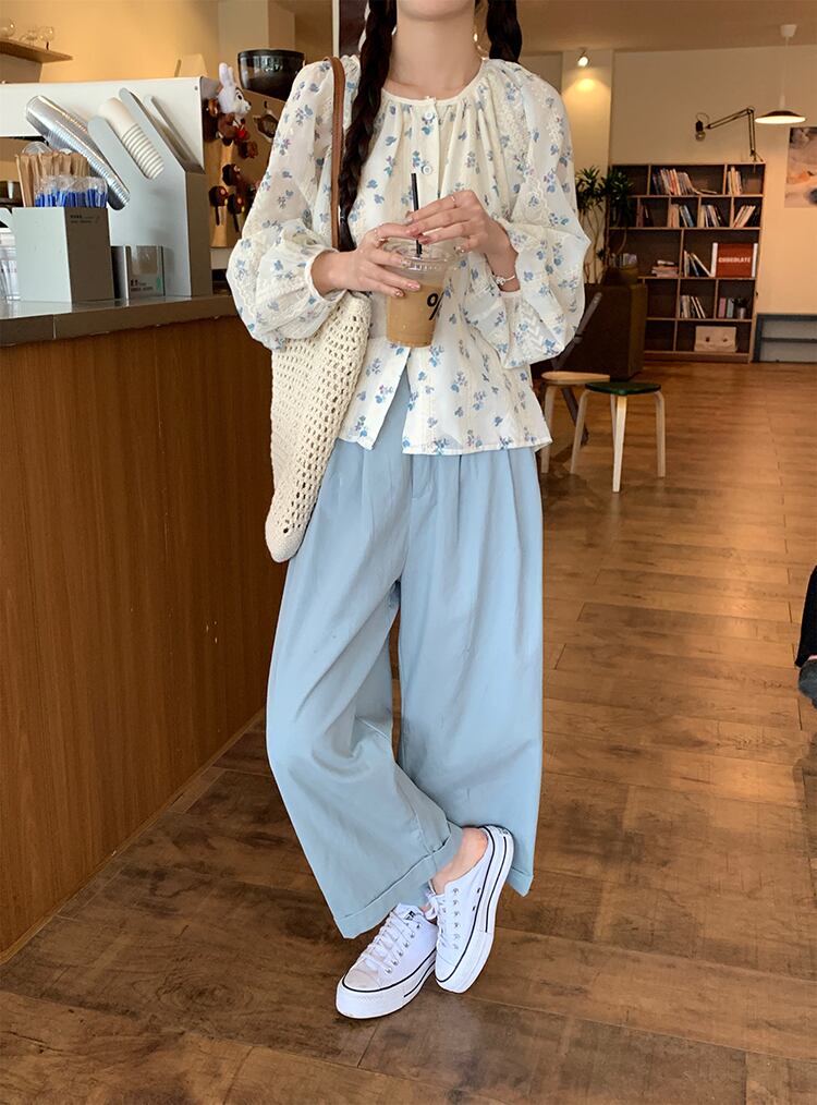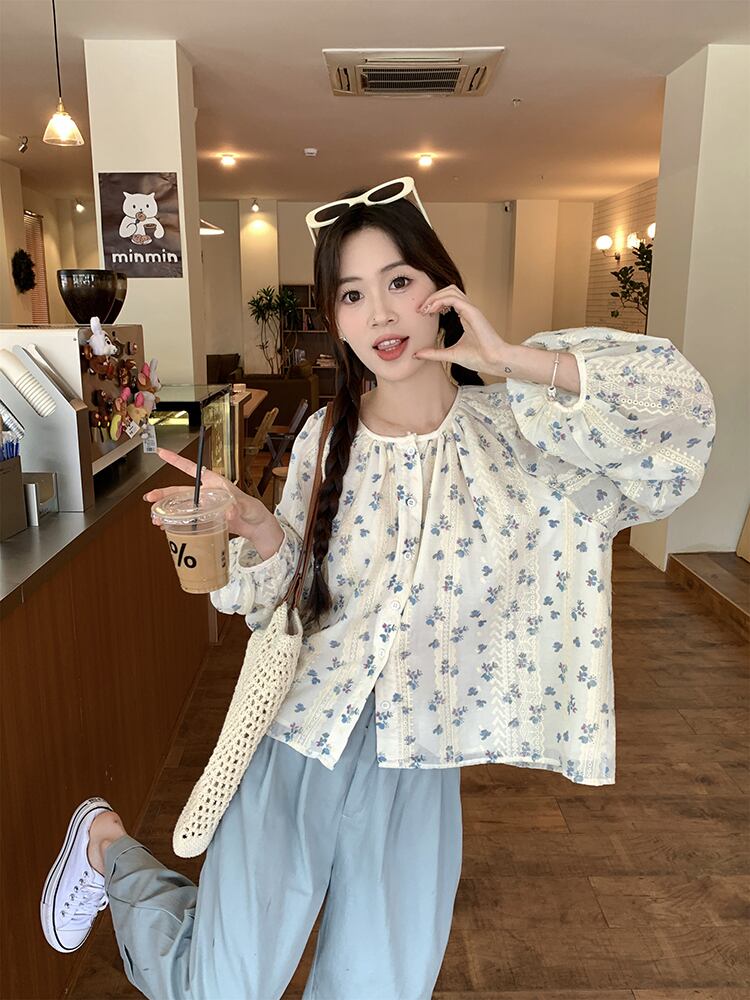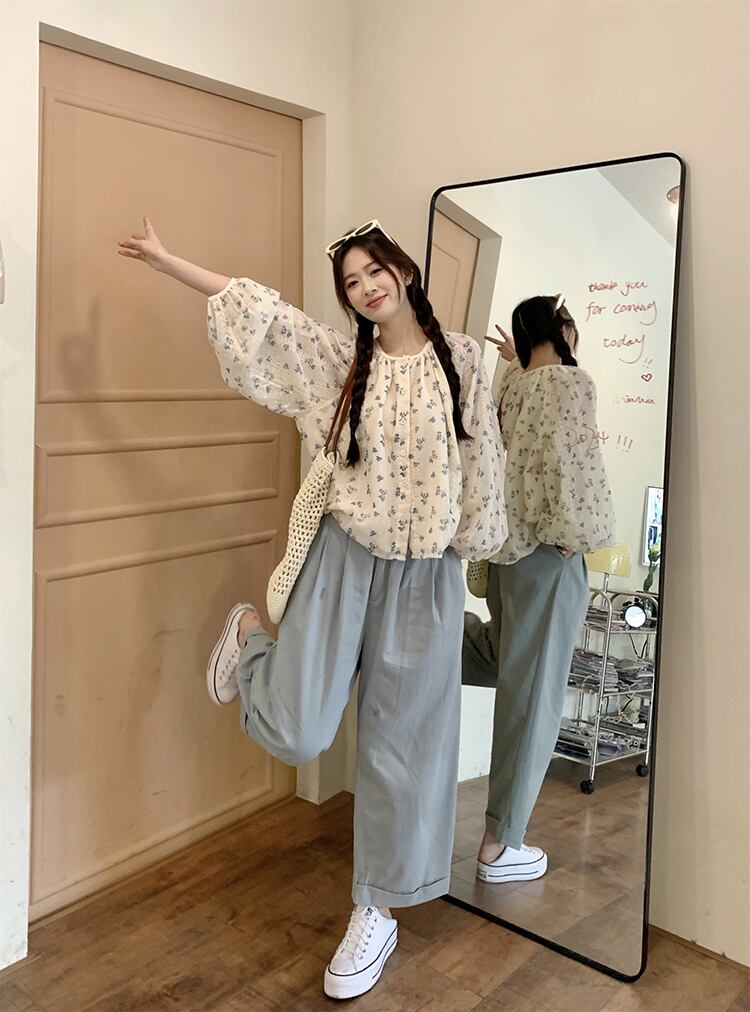 ふんわりギャザーでボリューム感たっぷりに仕立てた花柄ブラウス。