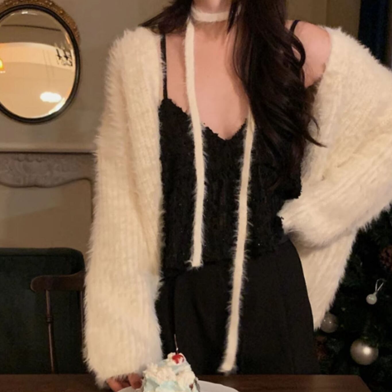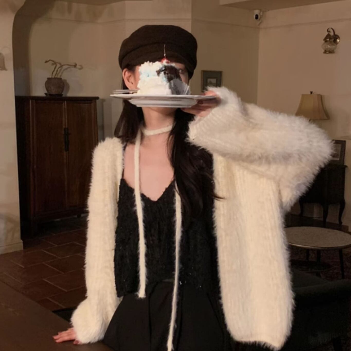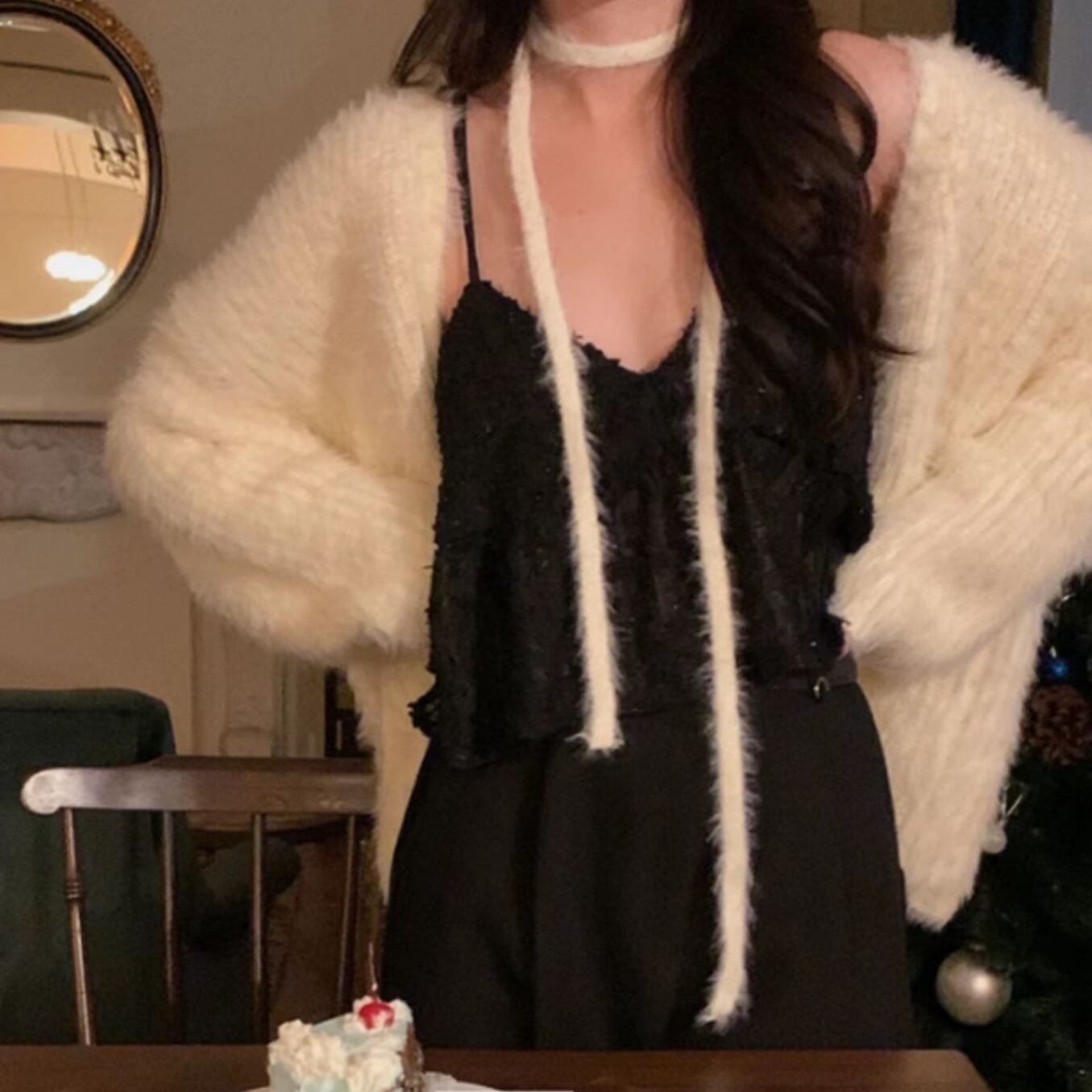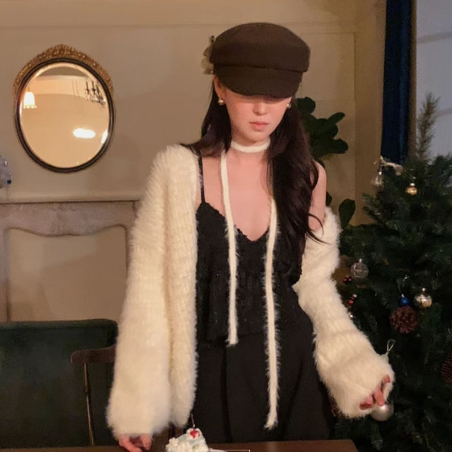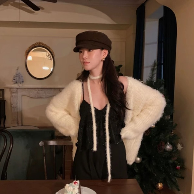 ミックス糸のフワフワ感がドット柄用なニュアンスを醸し出す可愛いデザイン。