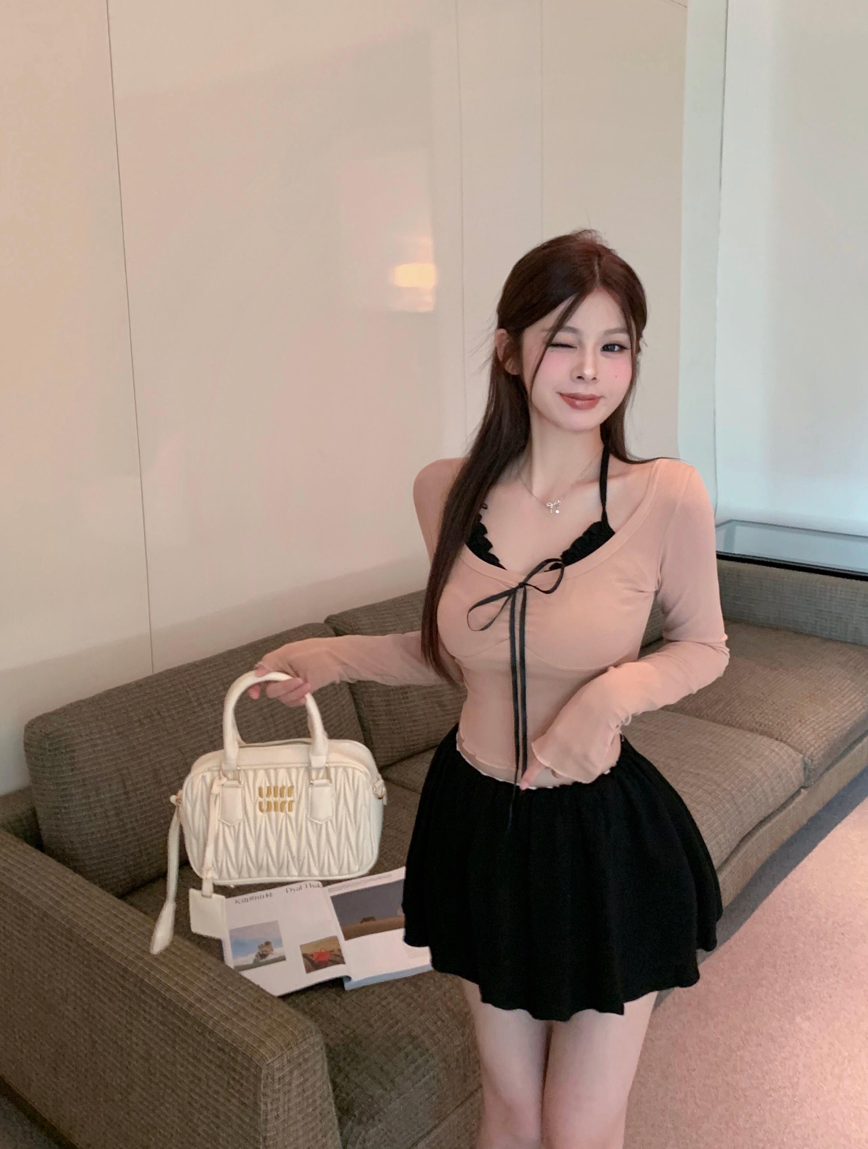 カットソー トップス デート フェイクレイヤード リボン ギャザー キャミソール ラウンドネック バイカラー ツートーン タイト 袖あり リボン 長袖 かわいい 大人可愛い きれいめ シンプル カジュアル 大人 上品 おしゃれ お洒落 主役級 存在感 春 秋 冬 10代 20代 30代 レディース 女性用 OL 学生 デート お出かけ 公園デビュー 女子会 休日 イベント 旅行 着回し 普段使い コーデ 楽ちん モテ インスタ映え ワンサイズ ミルクティー