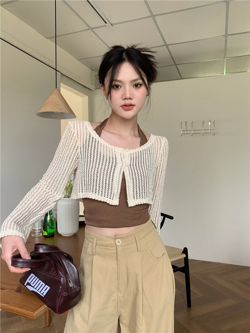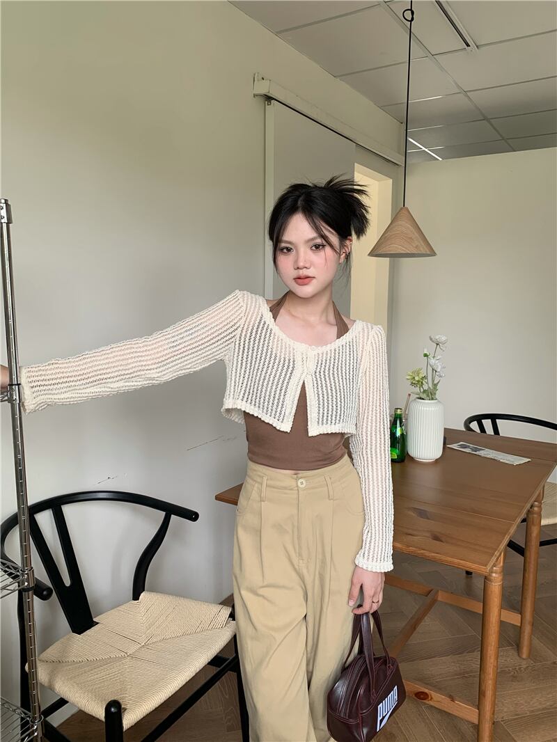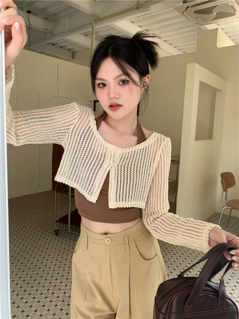 涼しげなメッシュ感がこなれた、広め襟元のショート丈カーディガン。