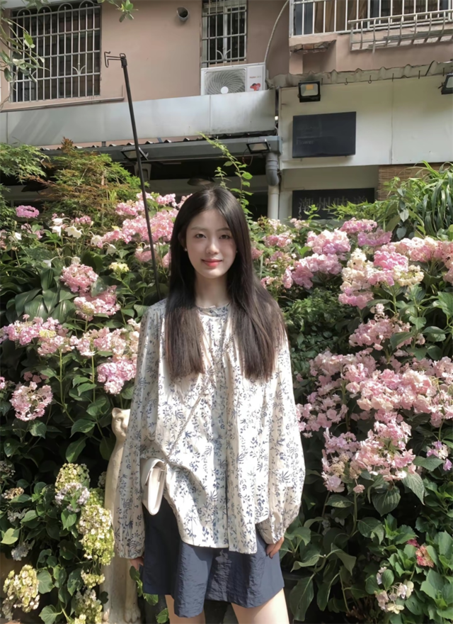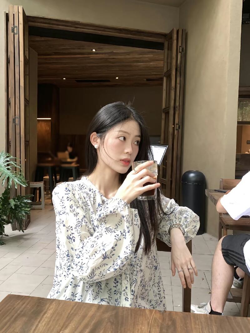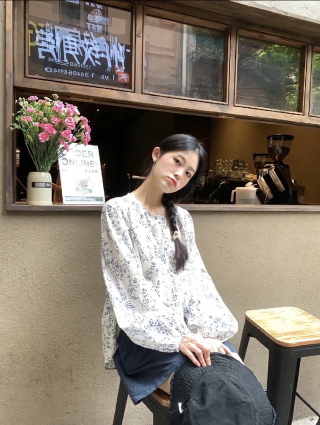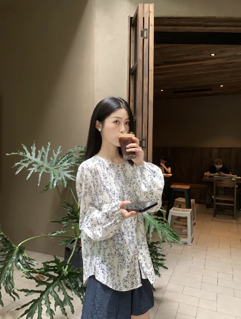 ふんわりギャザーでボリューム感たっぷりに仕立てた、落ち着いた淡い花柄のブラウス。
