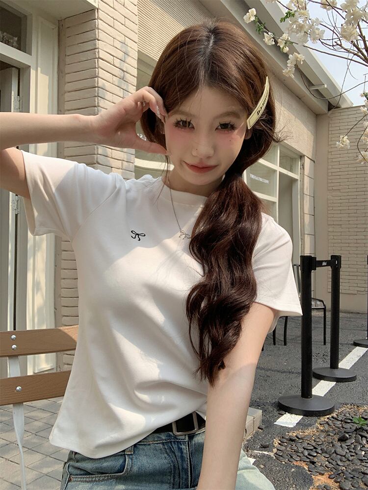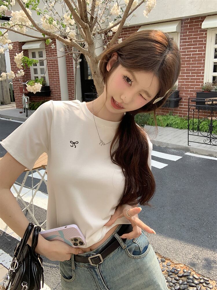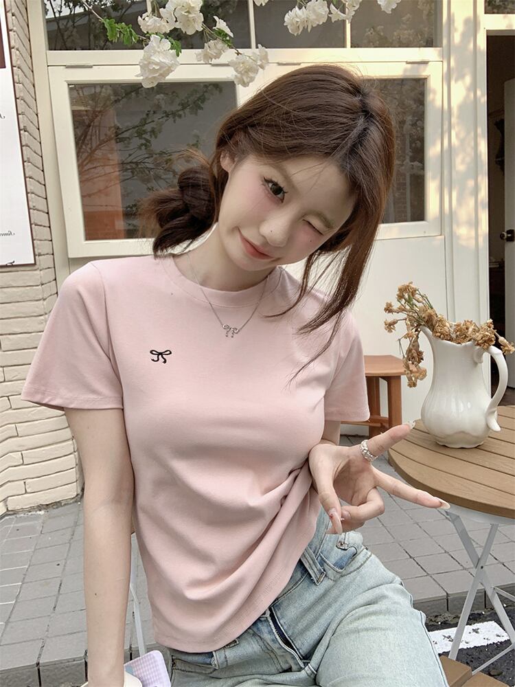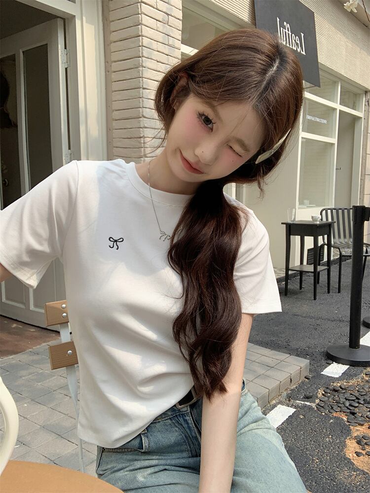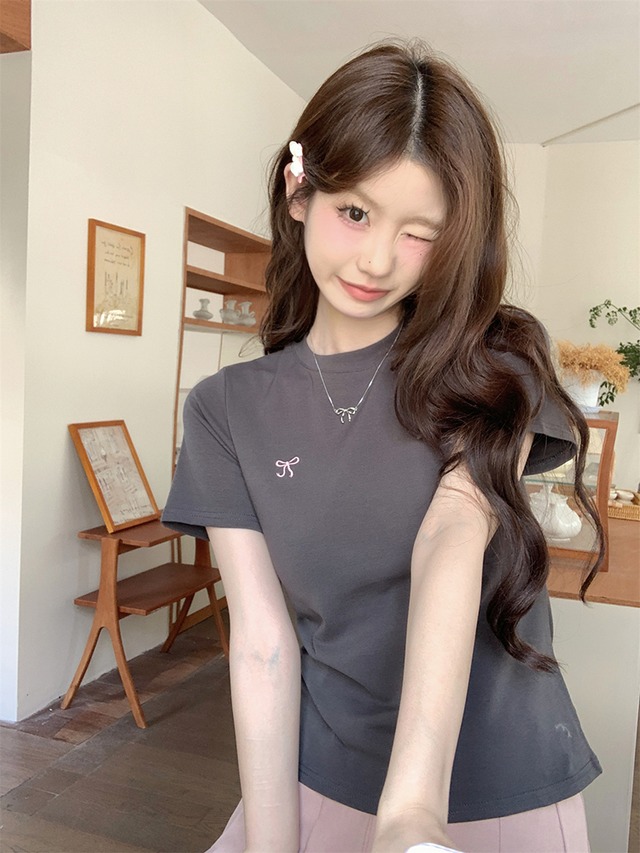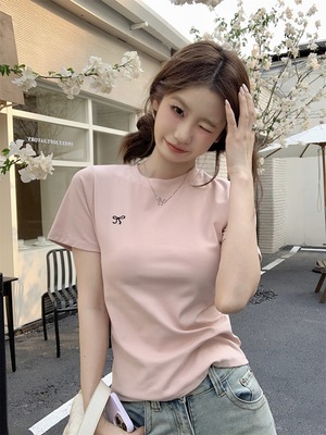 トップス Tシャツ カットソー 袖あり 半袖 クロップ丈 刺繍 ショート丈 タイト リボン クルーネック スリム ストレート 伸縮性 きれいめ シンプル カジュアル クラシカル 大人 おしゃれ お洒落 大人可愛い 大人女子 こなれ感 無地 春 夏 10代 20代 30代 40代 レディース 女性用 オフィス OL 通勤 学生 通学 デート お出かけ お泊まり 休日 アウトドア 旅行 着回し 普段使い ワンサイズ ホワイト ピンク グレー