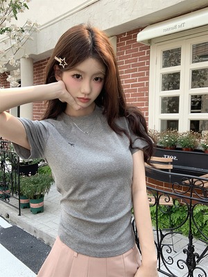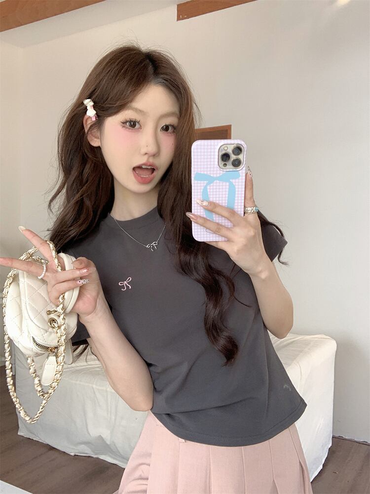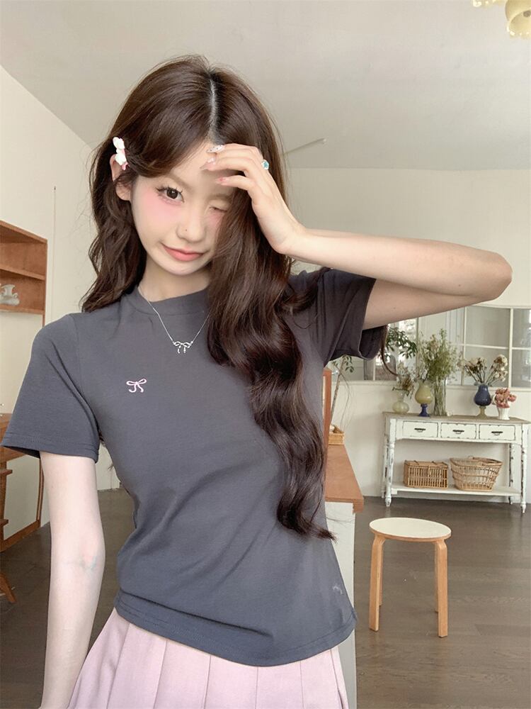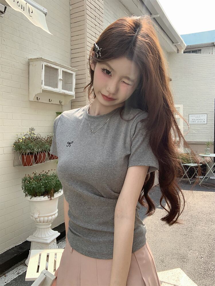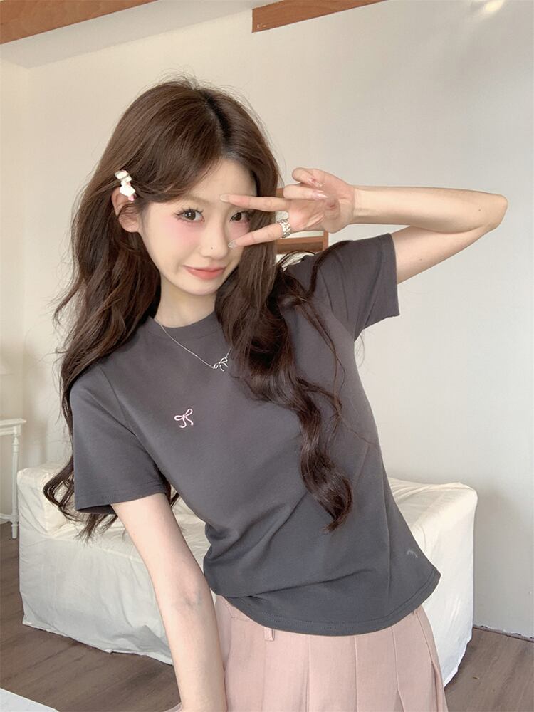 トップス Tシャツ カットソー 袖あり 半袖 クロップ丈 刺繍 ショート丈 タイト リボン クルーネック スリム ストレート 伸縮性 きれいめ シンプル カジュアル クラシカル 大人 おしゃれ お洒落 大人可愛い 大人女子 こなれ感 無地 春 夏 10代 20代 30代 40代 レディース 女性用 オフィス OL 通勤 学生 通学 デート お出かけ お泊まり 休日 アウトドア 旅行 着回し 普段使い ワンサイズ ホワイト ピンク グレー