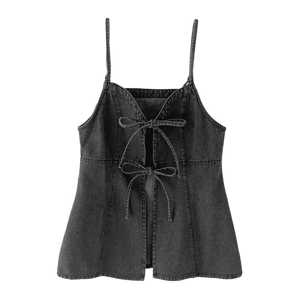 ビスチェ トップス キャミソール デニム 2WAY リボン ギャザー ペプラム Vネック フレア ショート丈 ノースリーブ かわいい 大人可愛い シンプル カジュアル きれいめ おしゃれ お洒落 キュート 存在感 春 夏 レディース ママ 女の子 学生 通学 デート お出かけ 女子会 休日 普段使い 韓国風 オルチャン 脚長 M L ブラック ネイビー