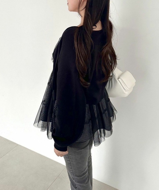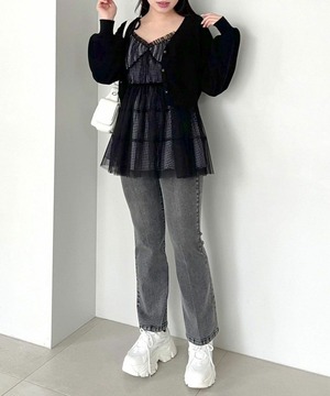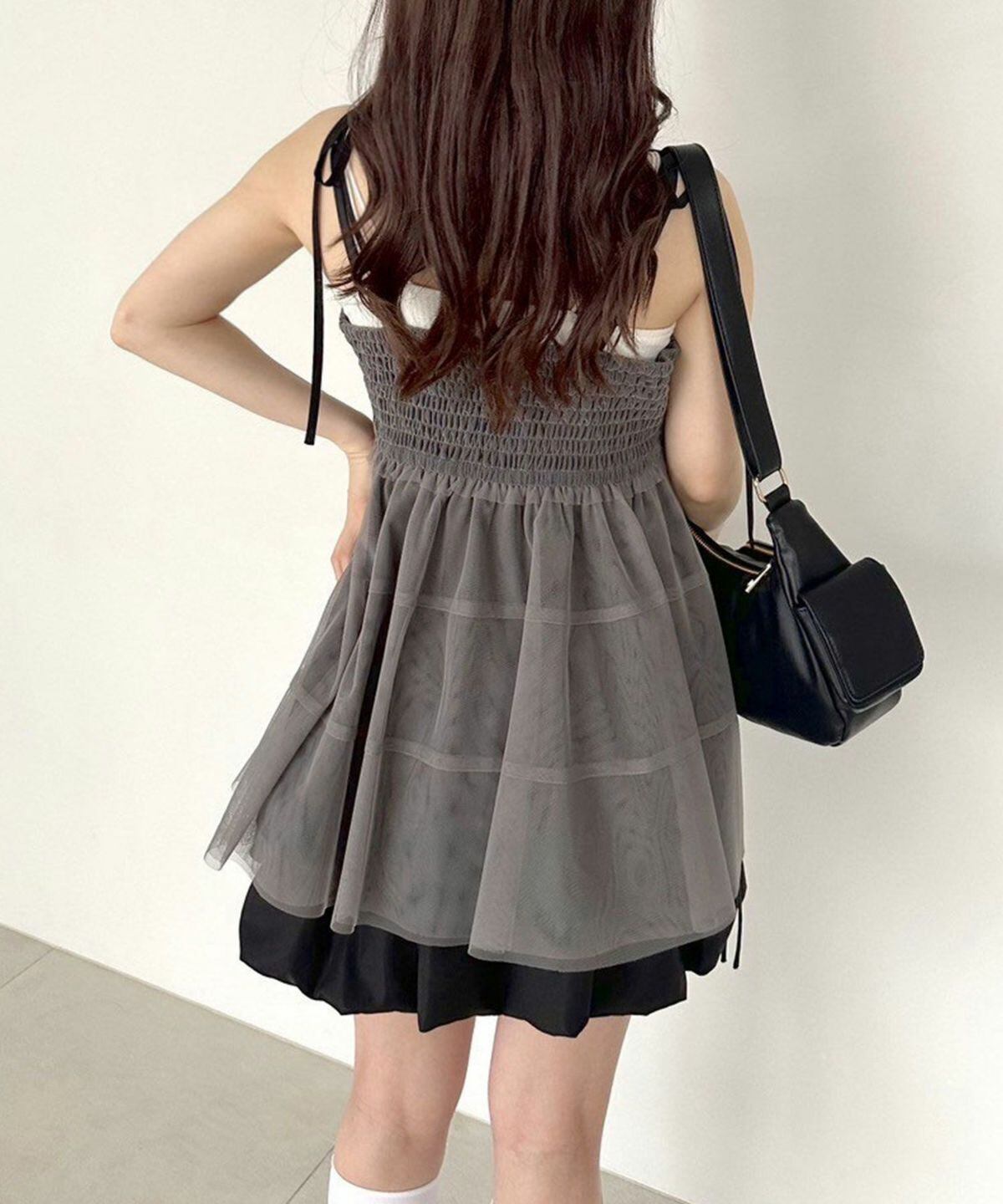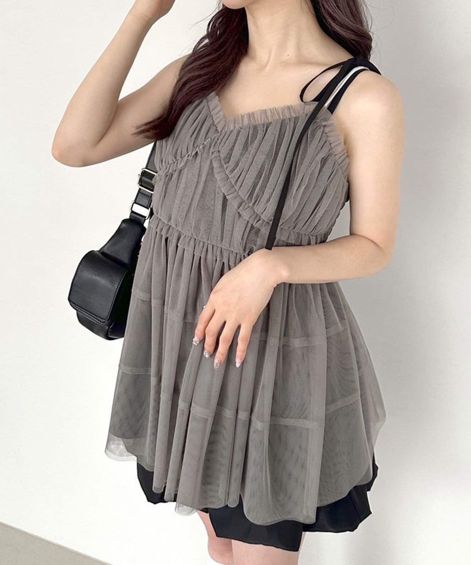 透け感のあるティアード切り替えチュールとフリルでドレッシーなニュアンスを取り入れられます。