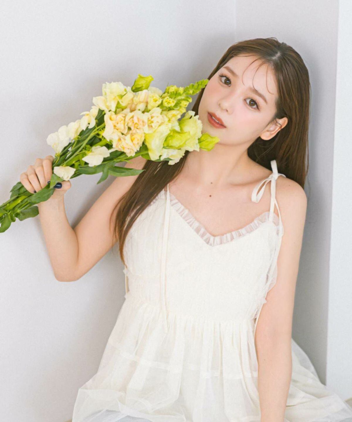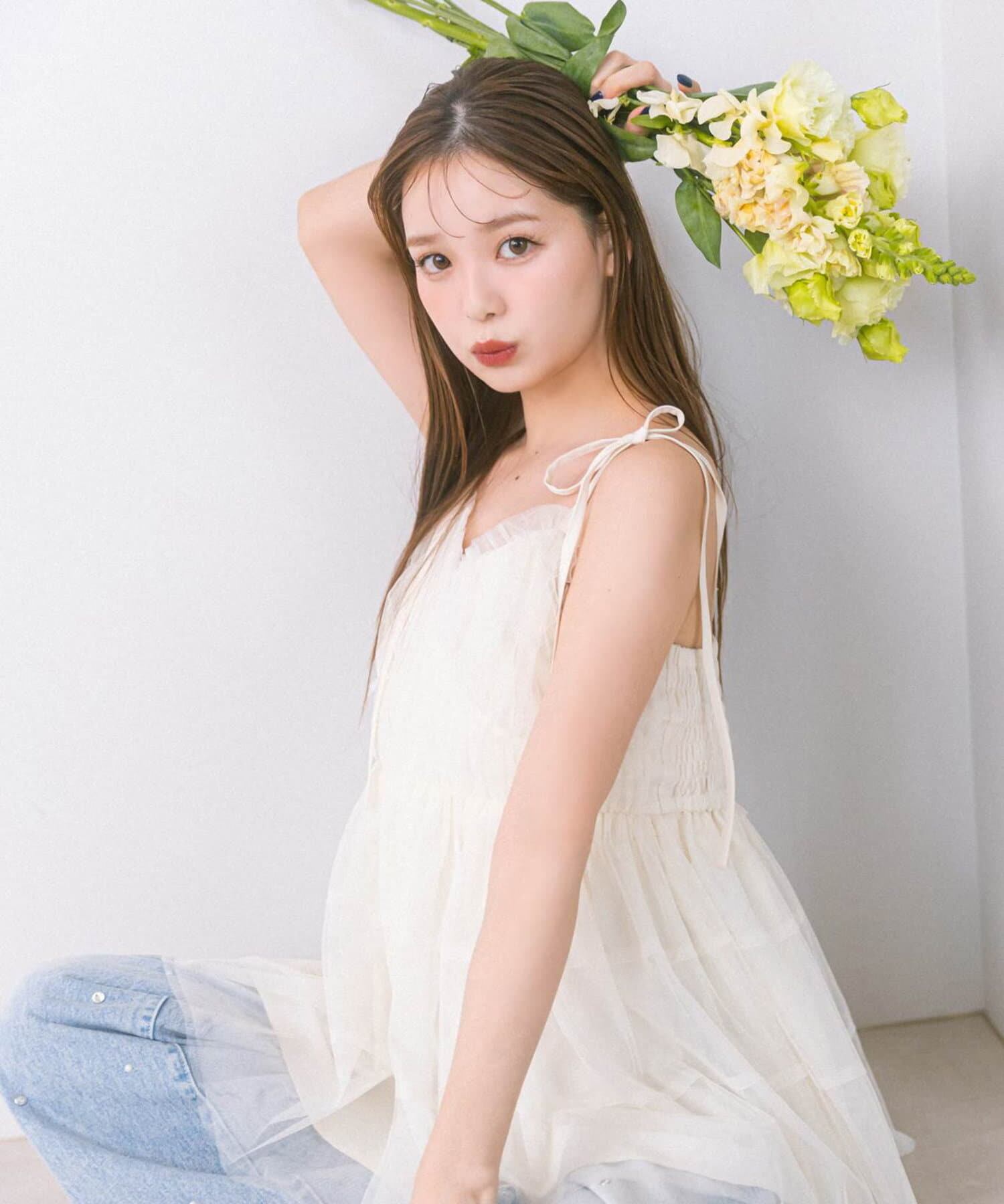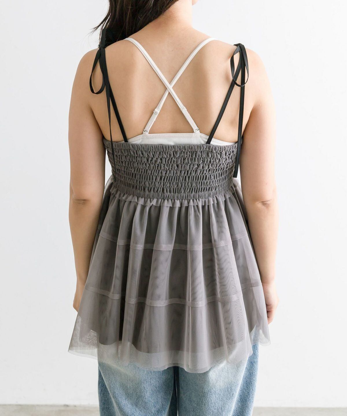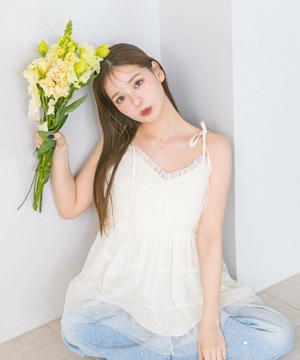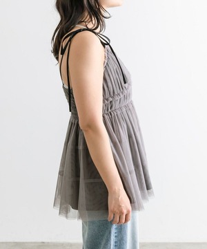 襟元ゆったりとVネックとチュールのフンワリ感がこなれた印象を与えてくれるキャミソールビスチェです。