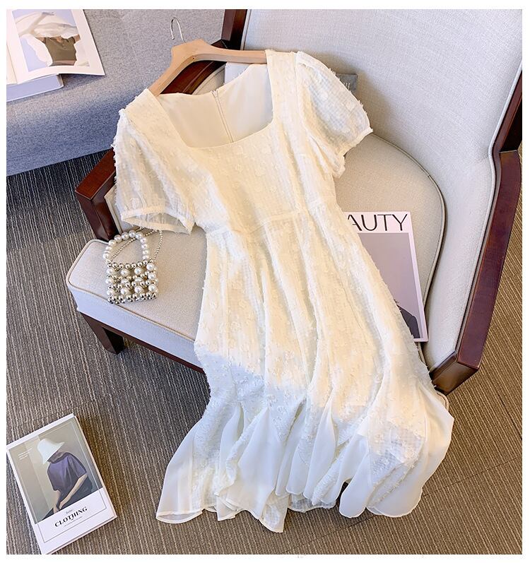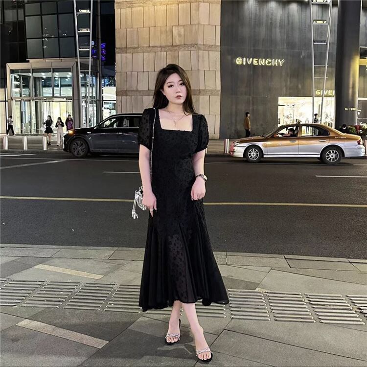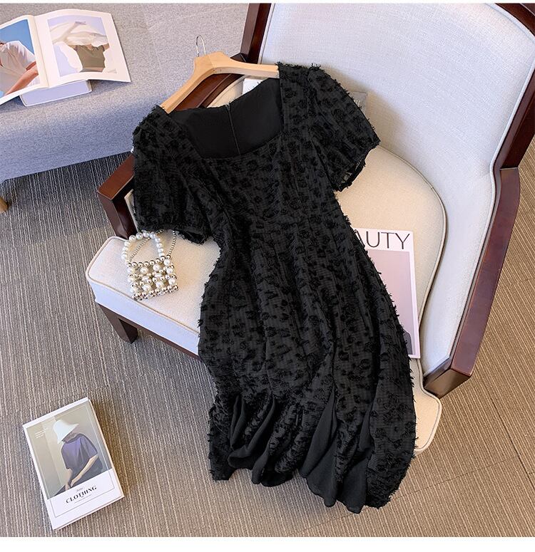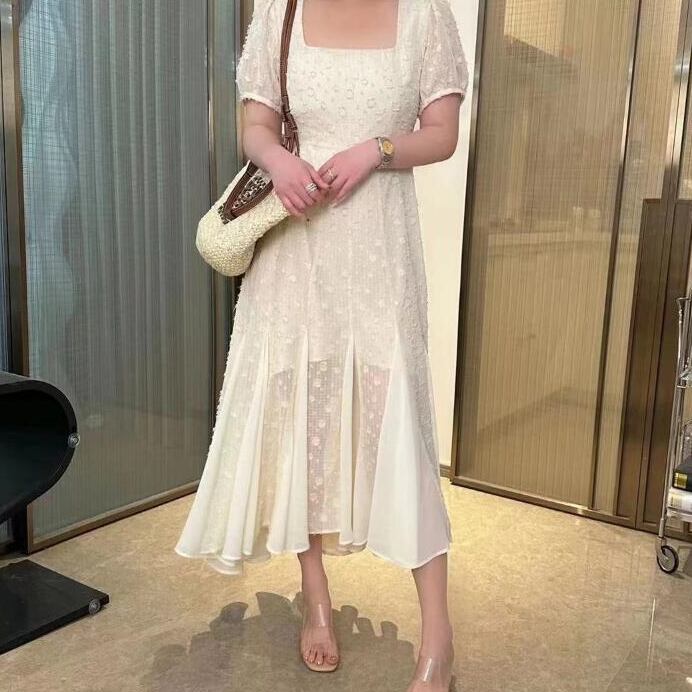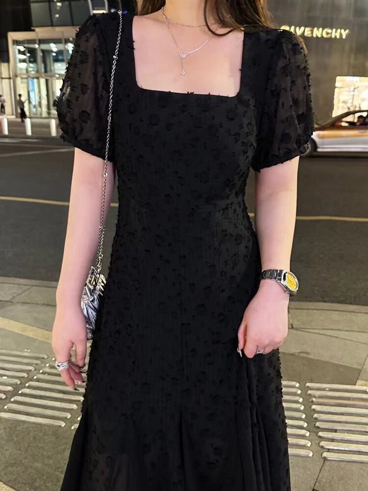 ワンピース 半袖 ミモレ丈 レトロ クラシカル 膝下 袖あり パフスリーブ スクエアネック ジャガード ドット柄 水玉 襟付き 透け感 レース 細身 ハイウエスト 大人可愛い きれいめ シンプル カジュアル 大人 上品 お洒落 レトロ 大人女子 こなれ感 ガーリー 主役級 抜け感 無地 春 夏 秋 20代 30代 40代 ママ 学生 通学 デート お出かけ 女子会 休日 旅行 普段使い 重ね着 オルチャン モテ 定番 トレンド インスタ映え ブラック アプリコット M L XL 2XL 3XL 4XL