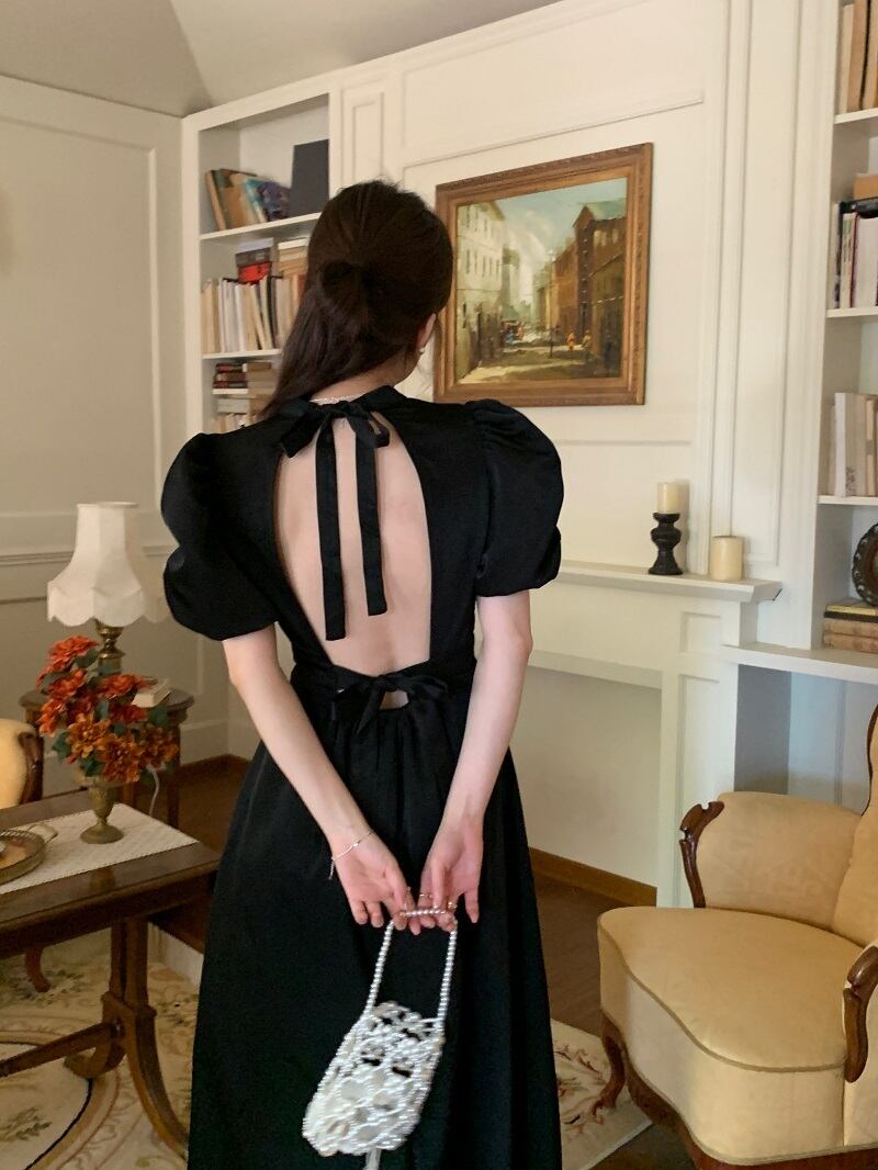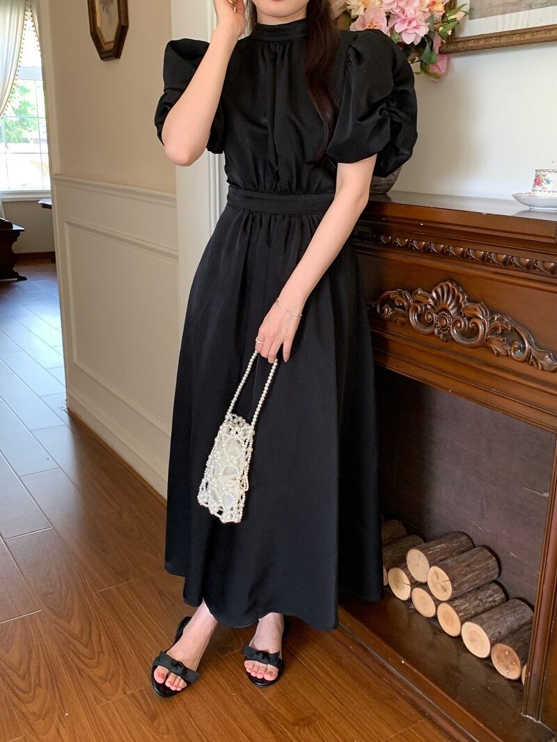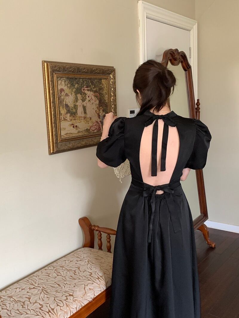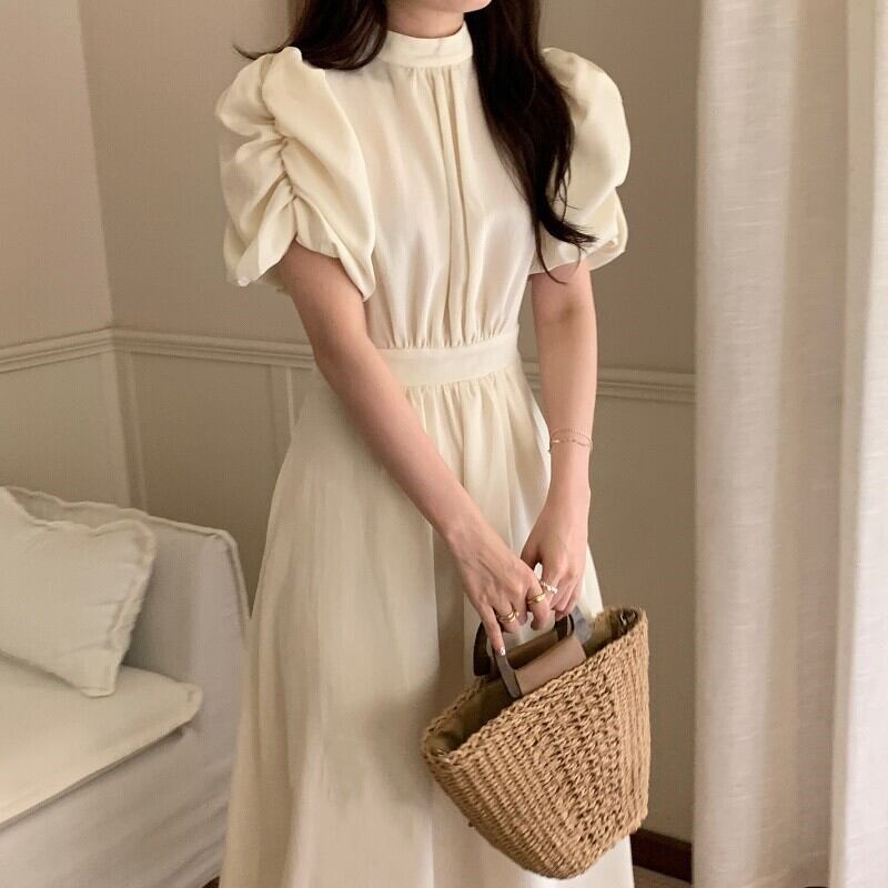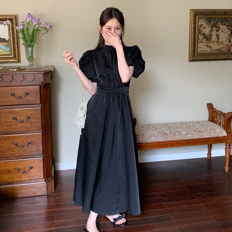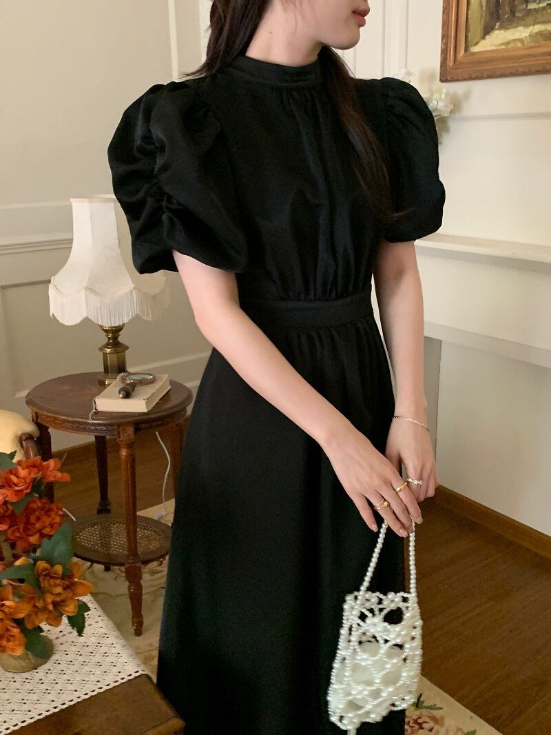 ワンピース 半袖 ドレス レトロワンピース パワーショルダー バックオープン バックコンシャス リボン シャーリング ギャザー クラシカル 膝下 ミモレ丈 袖あり パフスリーブ スタンドカラー襟付き 細身 ハイウエスト 大人可愛い きれいめ シンプル カジュアル 大人 上品 お洒落 レトロ 大人女子 こなれ感 ガーリー 主役級 抜け感 無地 春 夏 秋 20代 30代 40代 ママ 学生 通学 デート お出かけ 女子会 休日 旅行 普段使い トレンド インスタ映え ブラック オフホワイト ワンサイズ