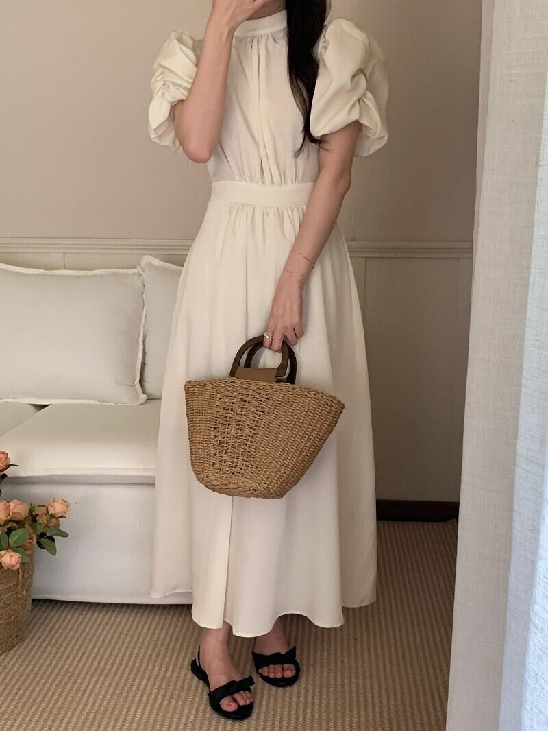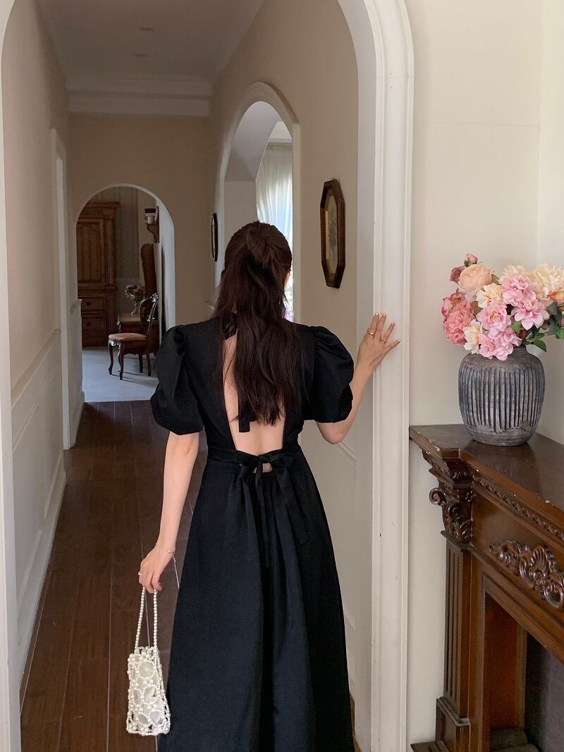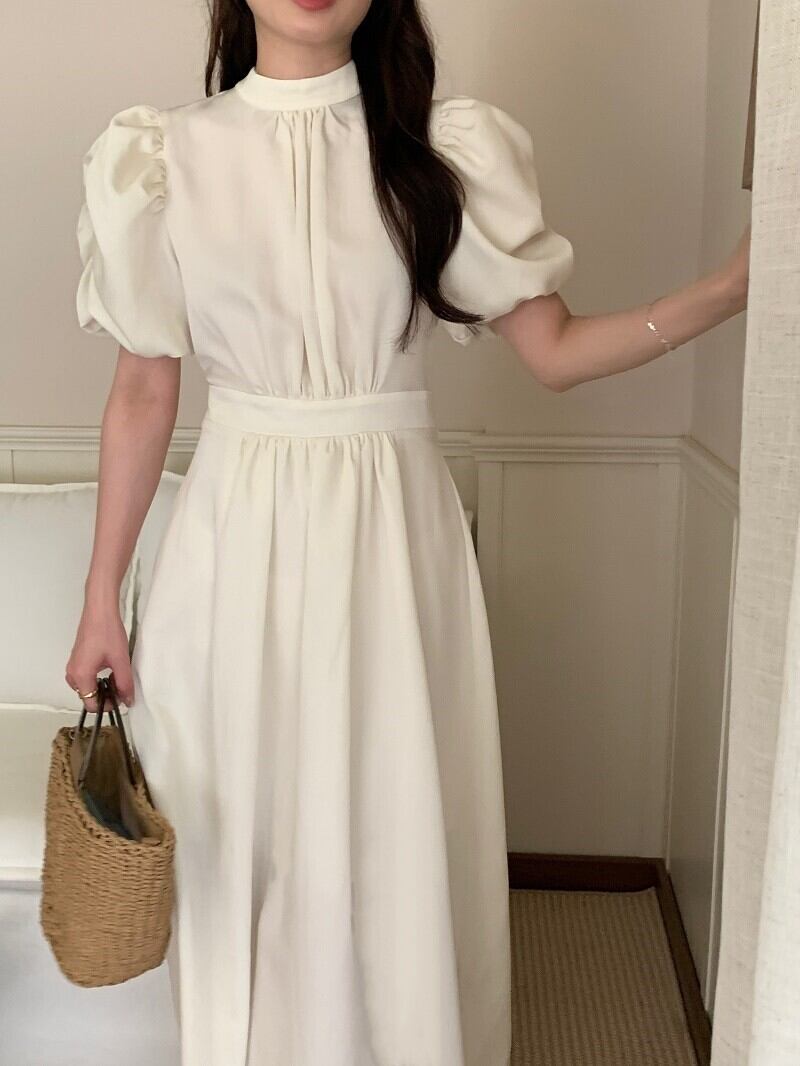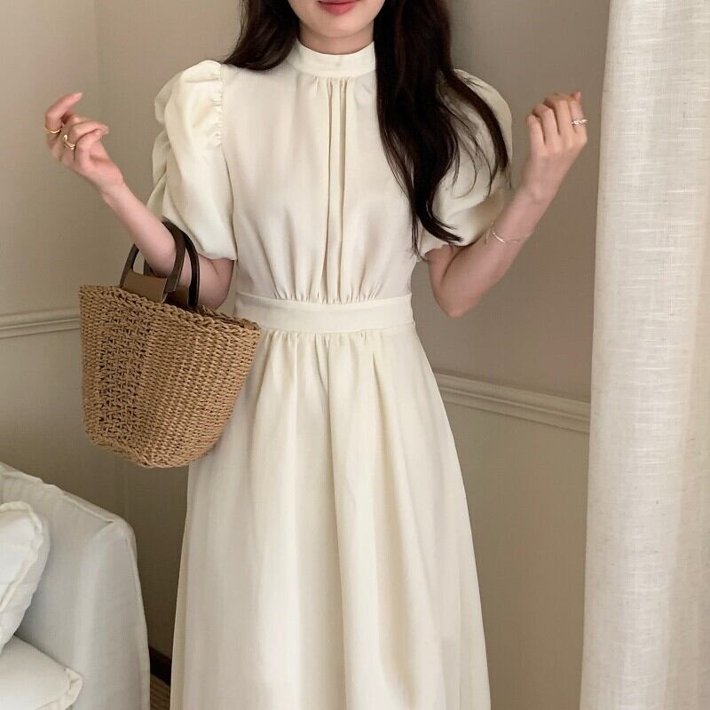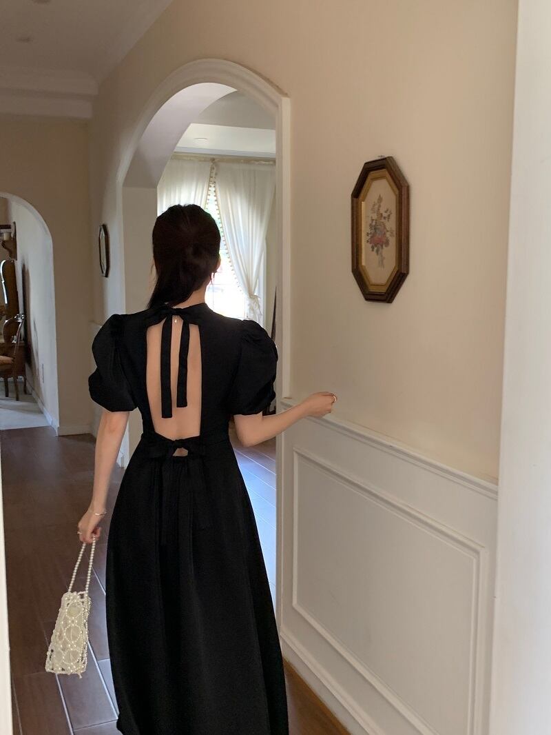 ワンピース 半袖 ドレス レトロワンピース パワーショルダー バックオープン バックコンシャス リボン シャーリング ギャザー クラシカル 膝下 ミモレ丈 袖あり パフスリーブ スタンドカラー襟付き 細身 ハイウエスト 大人可愛い きれいめ シンプル カジュアル 大人 上品 お洒落 レトロ 大人女子 こなれ感 ガーリー 主役級 抜け感 無地 春 夏 秋 20代 30代 40代 ママ 学生 通学 デート お出かけ 女子会 休日 旅行 普段使い トレンド インスタ映え ブラック オフホワイト ワンサイズ