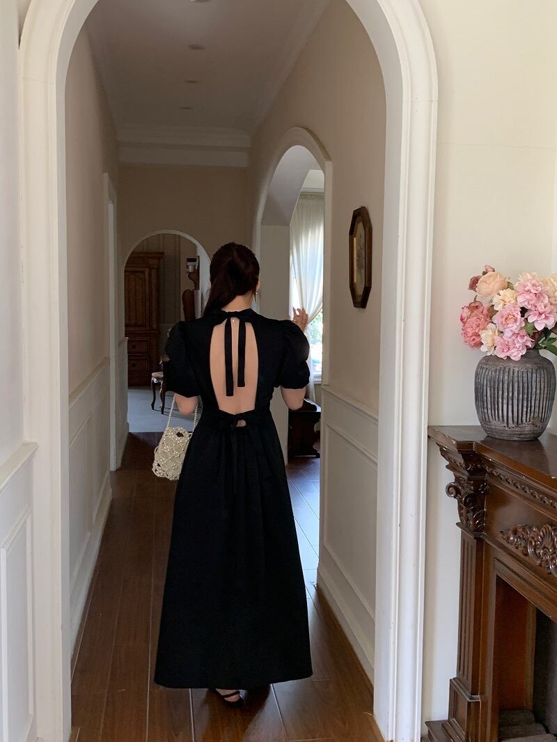 フロントはシックなスタンドカラーで、バックはリボン付きのオープンデザインでセクシーです。