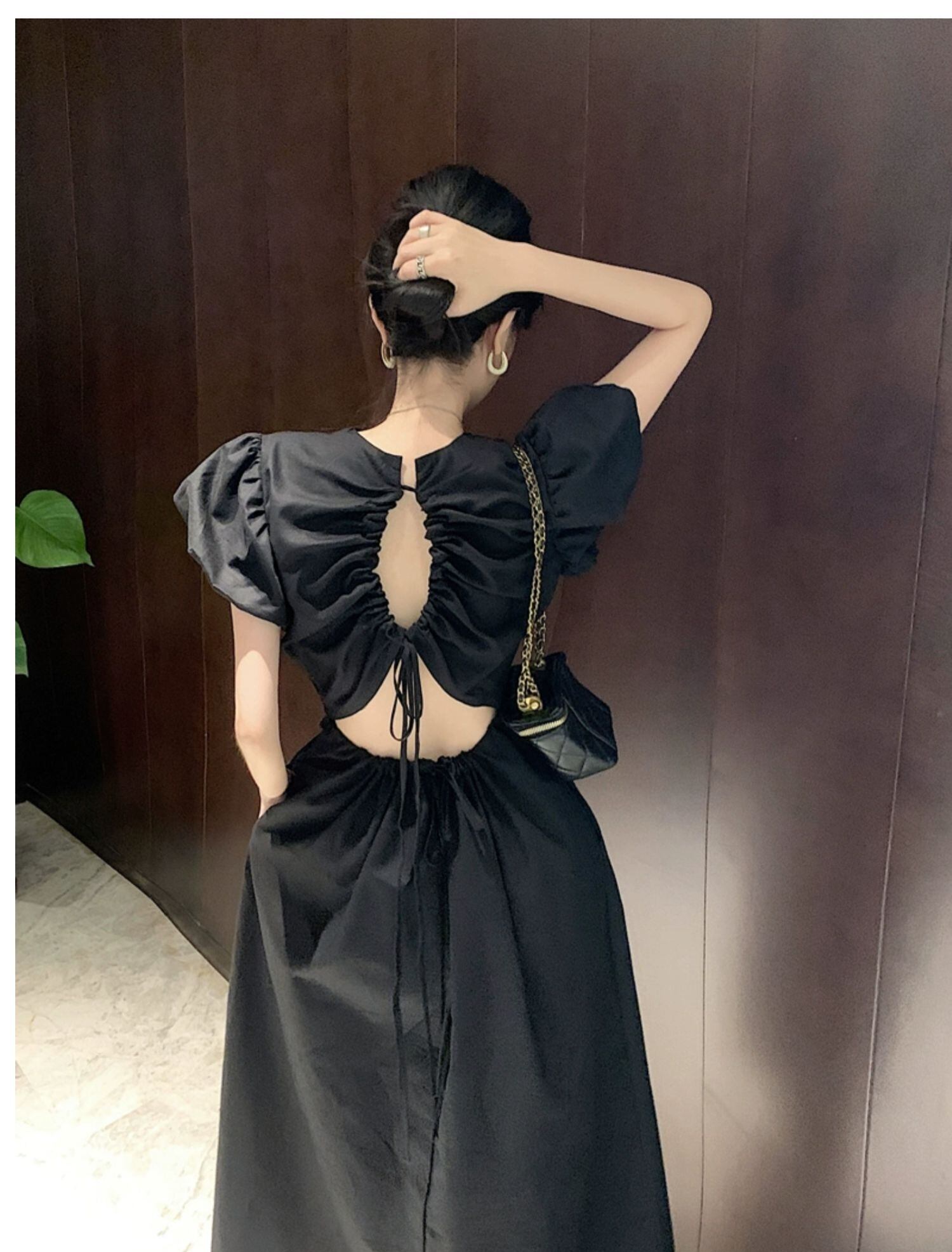 フロントはシックなスタンドカラーで、バックはリング状にギャザーをあしらったオープンデザインでセクシーです。