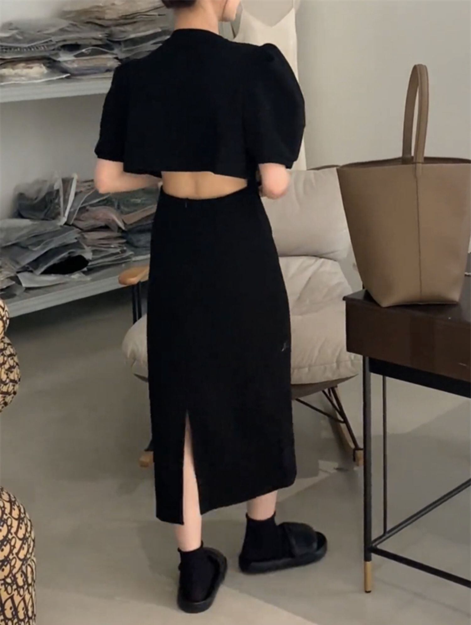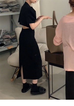 バックのカットアウトで後ろ姿までスタイルアップが叶う、上品なデザインです。