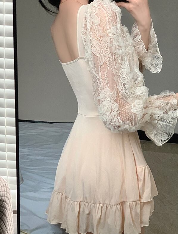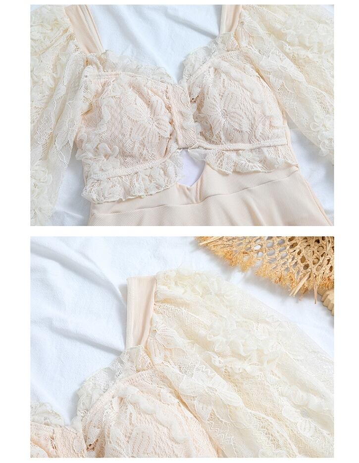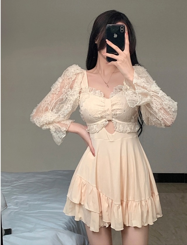 水着 オールインワン ワンピース ギャザー バックオープン レース 花柄 キャンディースリーブ 長袖 フリル ミニスカート ハイウエスト カットアウト フリル ビキニ 体型カバー ショートパンツ 切り替え パッド付き 胸元 かわいい 大人可愛い セクシー sexy ゴージャス 華やか 大人 存在感 女っぽ 個性的 スタイリッシュ かっこいい エキゾチック アジアン 無地 20代 30代 レディース 女性用 美脚 着痩せ スタイルアップ 美スタイル 韓国系 ギフト M L XL アプリコット