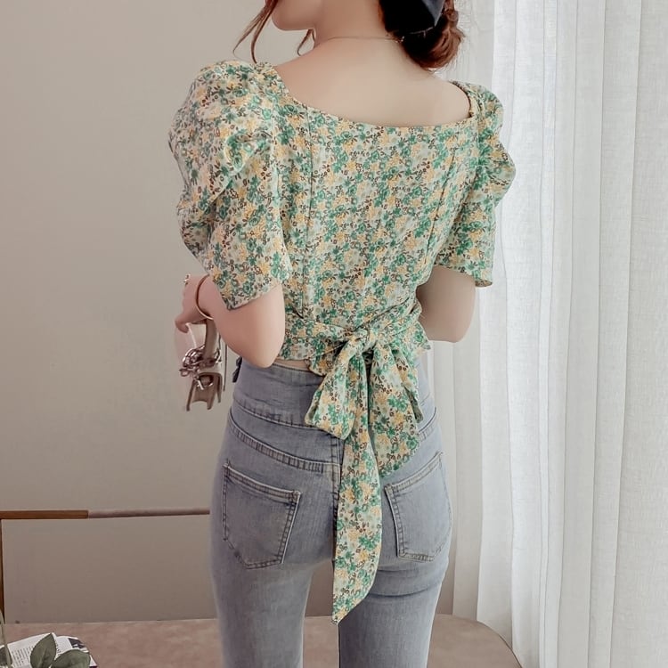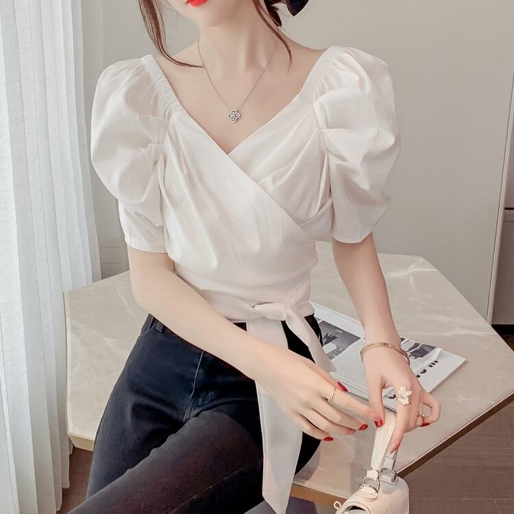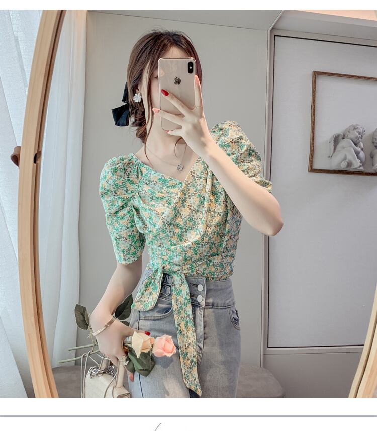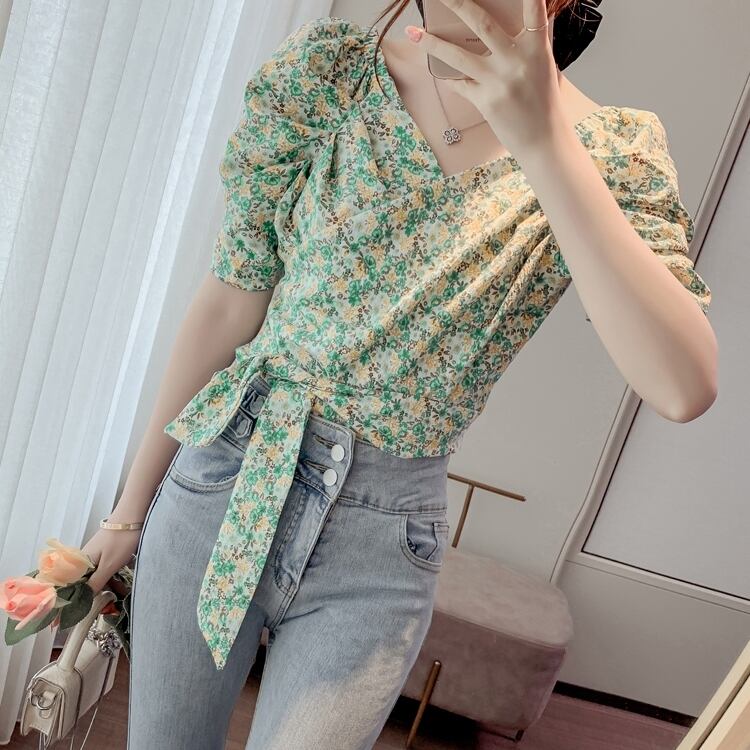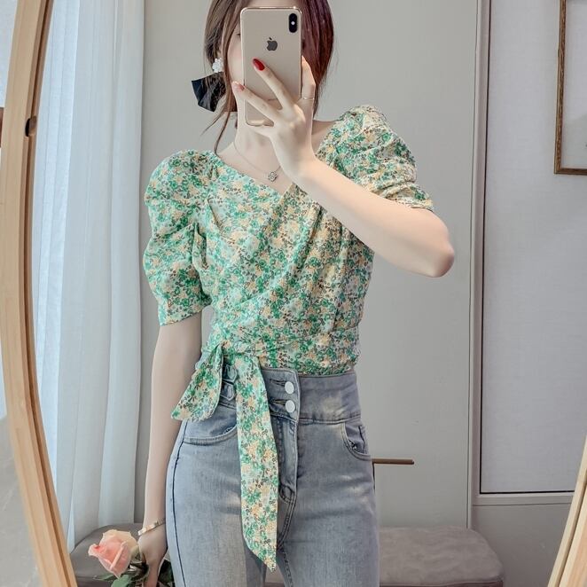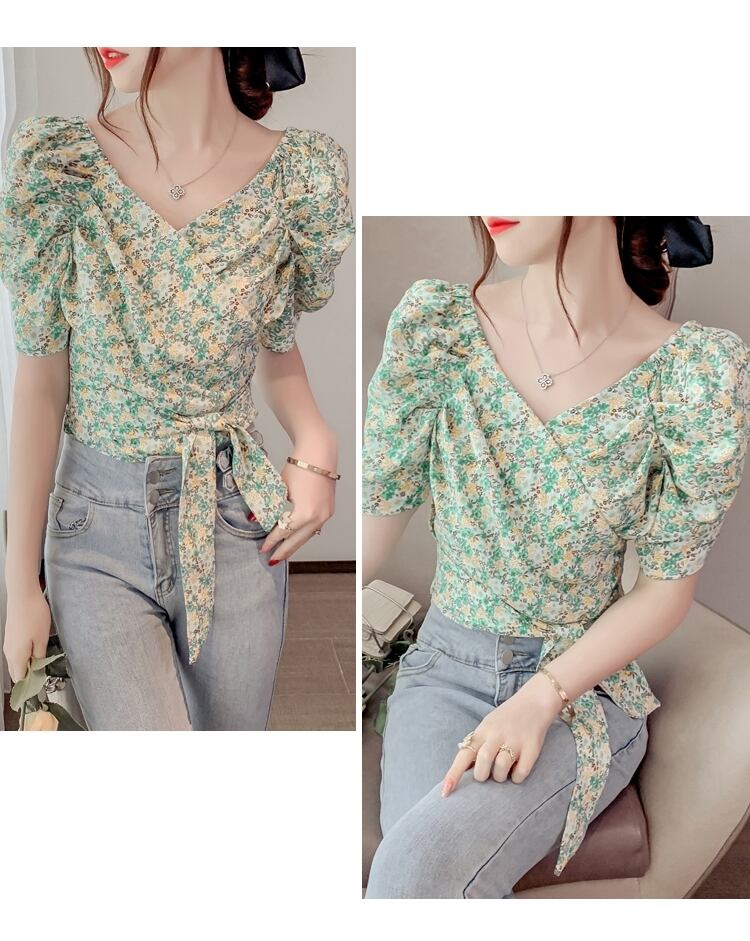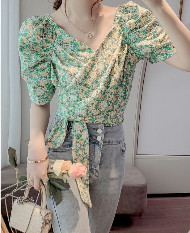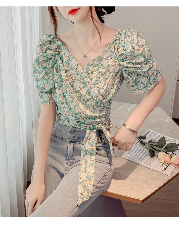 トップス ブラウス カシュクール Vネック リボン ショート丈 花柄 半袖 ふんわり袖 パフスリーブ ボリューム袖 かわいい 大人可愛い シンプル カジュアル きれいめ おしゃれ お洒落 上品 清楚 ナチュラル 涼しげ 春 夏 無地 レディース 女性用 ママ 女の子 学生 通学 デート お出かけ 公園デビュー 女子会 休日 普段使い 着回し 合わせやすい 韓国風 オルチャン ファッション コーデ スタイル S M L XL ホワイト グリーン