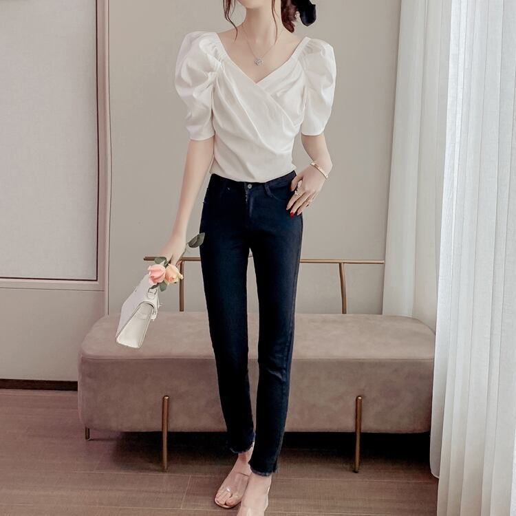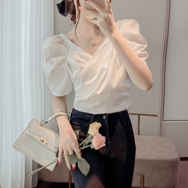 巻き付けたようなカシュクールの合わせ部分が可愛らしいゴム入りVネックのブラウス。