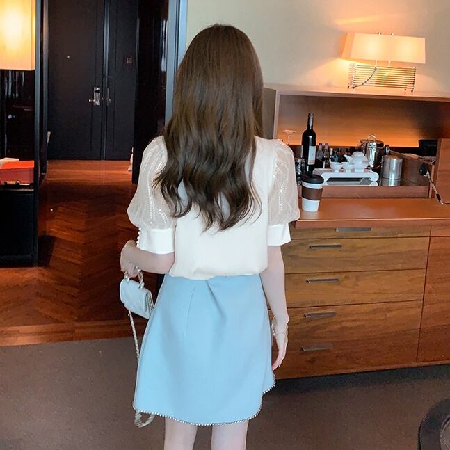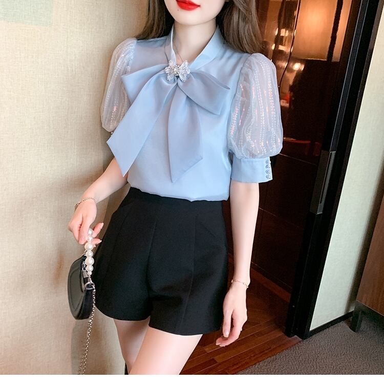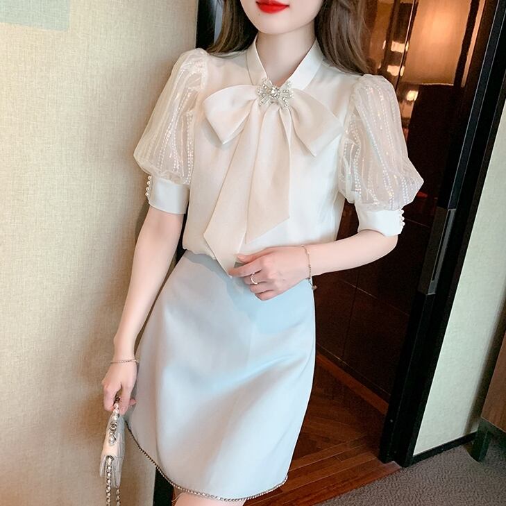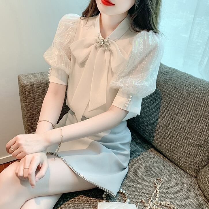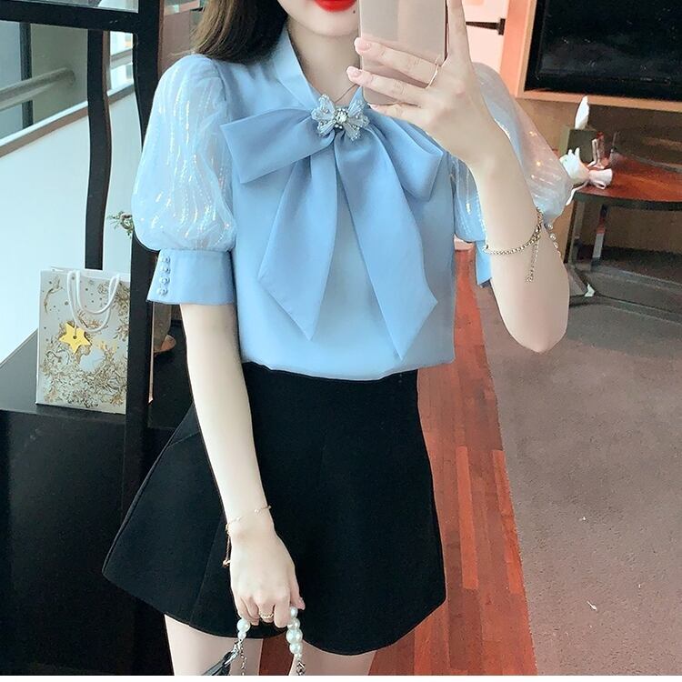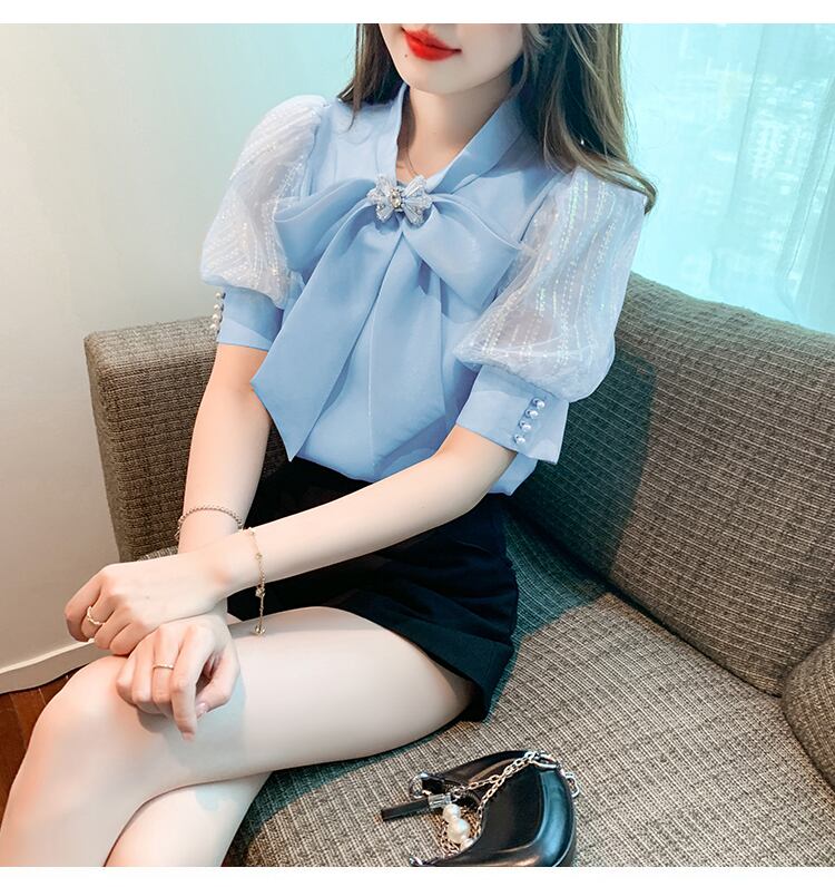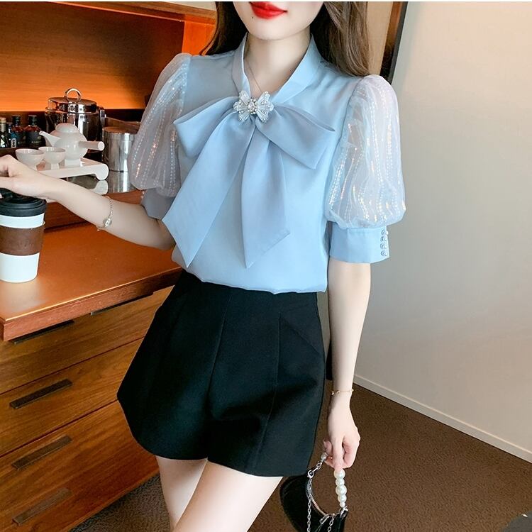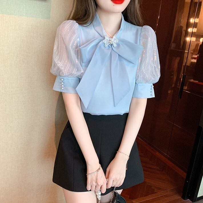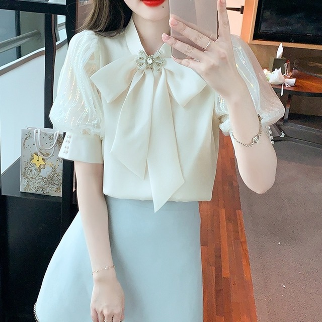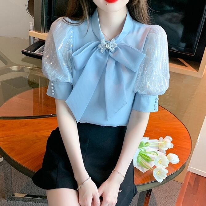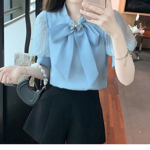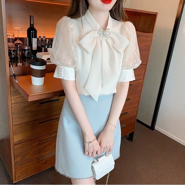 トップス ブラウス スタンドカラー ボウタイ リボン ボタン ビジュー モチーフ お花 ラインストーン パール ストライプ グリッター メッシュ チュール 透け感 半袖 シースルー タック パフスリーブ ボリューム袖 かわいい 大人可愛い シンプル カジュアル きれいめ おしゃれ お洒落 上品 清楚 ナチュラル 涼しげ 春 夏 無地 レディース 女性用 女の子 学生 通学 デート お出かけ 公園デビュー 女子会 休日 普段使い 着回し 合わせやすい ファッション コーデ スタイル アプリコット ブルー