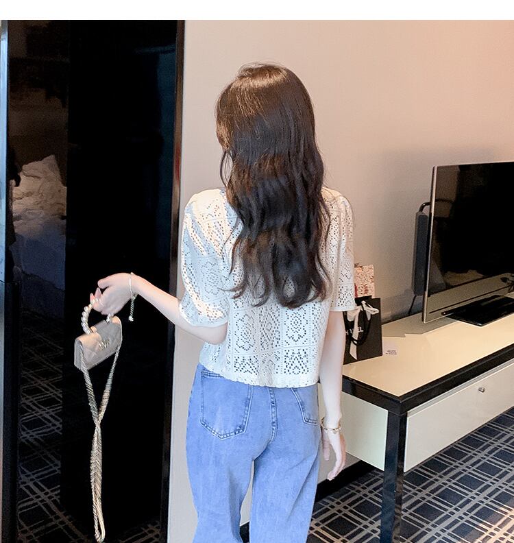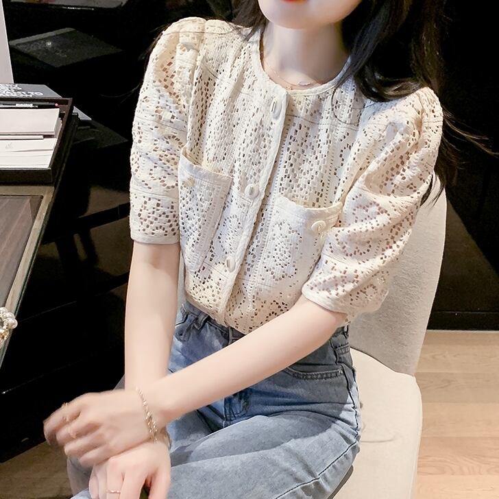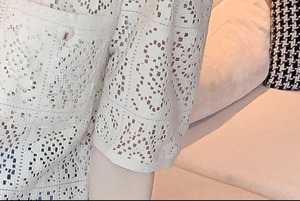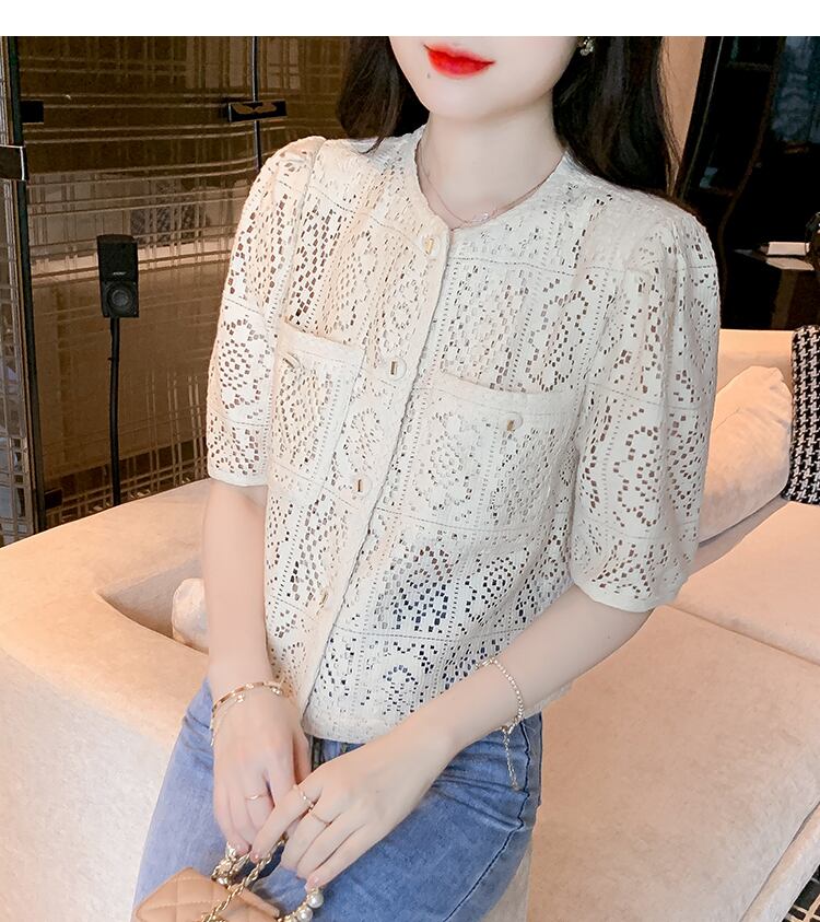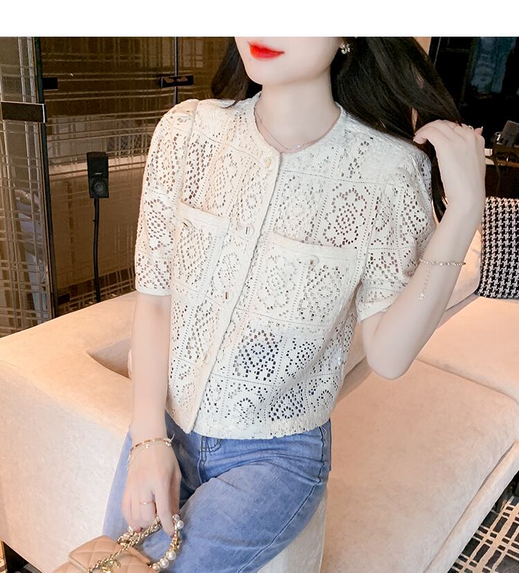 クロシェ編みのように涼し気な花柄総レースで仕立てたドーリーなレーストップス