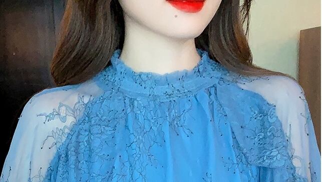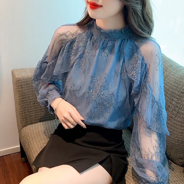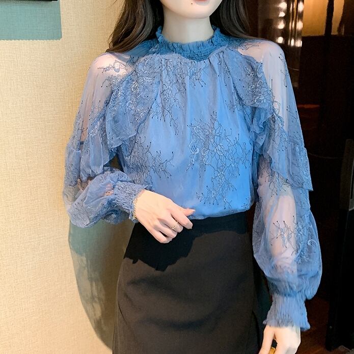 ブラウス トップス デート シャツ 袖あり 花柄 フリル スタンドカラー フリル レース 切り替え パフスリーブ フリル 長袖 かわいい 大人可愛い きれいめ シンプル カジュアル 大人 上品 おしゃれ お洒落 主役級 存在感 春 秋 10代 20代 30代 レディース 女性用 OL 学生 デート お出かけ 公園デビュー 女子会 休日 イベント 旅行 着回し 普段使い コーデ 楽ちん モテ インスタ映え ブルー S M L XL