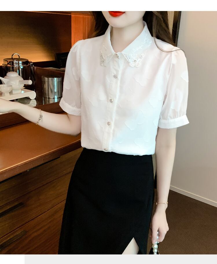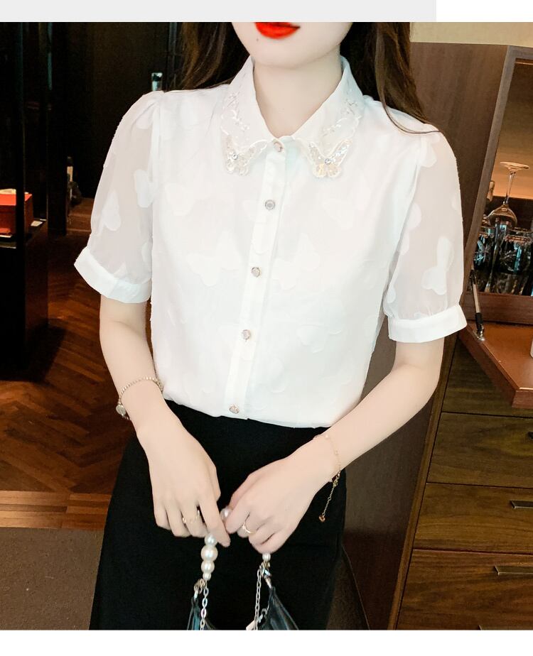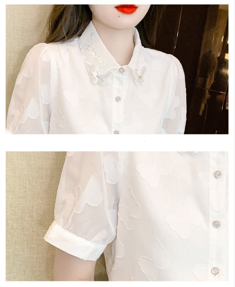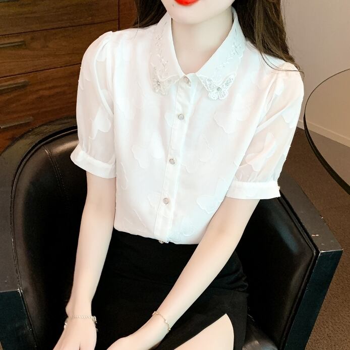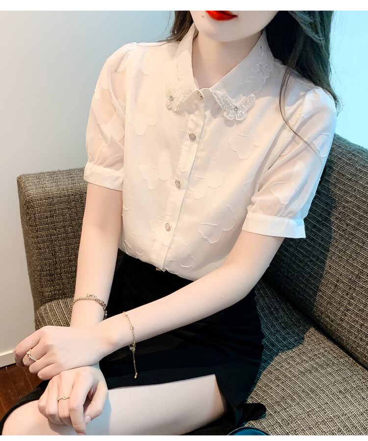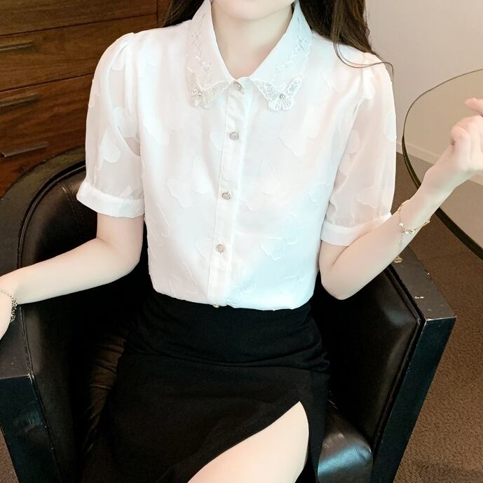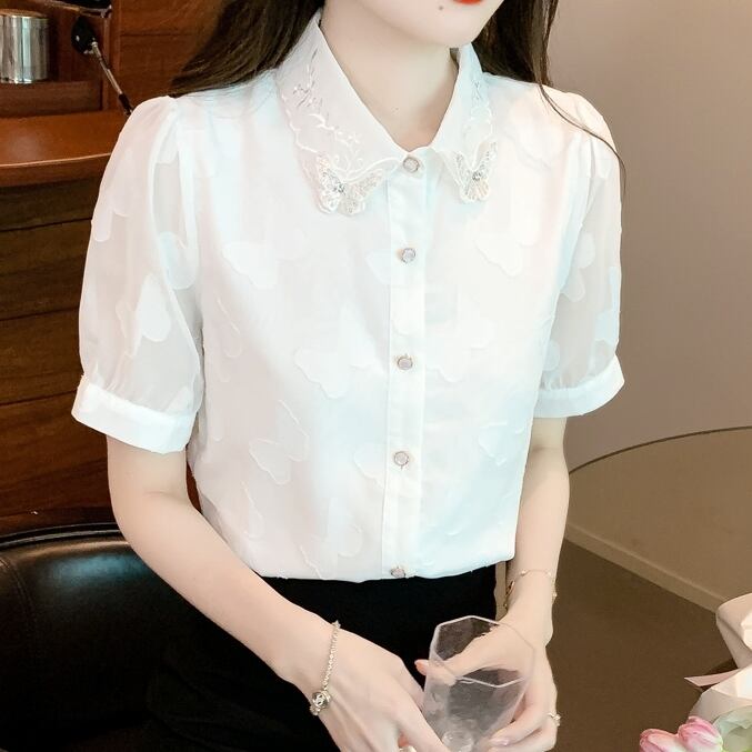 トップス ブラウス レギュラーカラー 蝶々 レース 刺繍 ラインストーン ビジュー モチーフ 半袖 シースルー タック パフスリーブ ボリューム袖 かわいい 大人可愛い シンプル カジュアル きれいめ おしゃれ お洒落 上品 清楚 ナチュラル 涼しげ 春 夏 無地 レディース 女性用 女の子 学生 通学 デート お出かけ 公園デビュー 女子会 休日 普段使い 着回し 合わせやすい ファッション コーデ スタイル ホワイト S M L XL 2XL