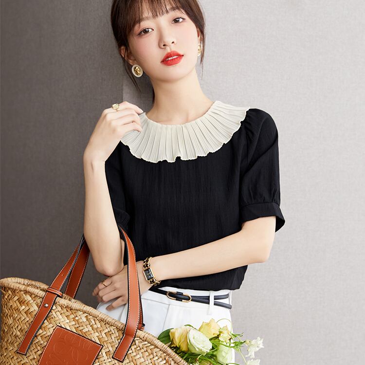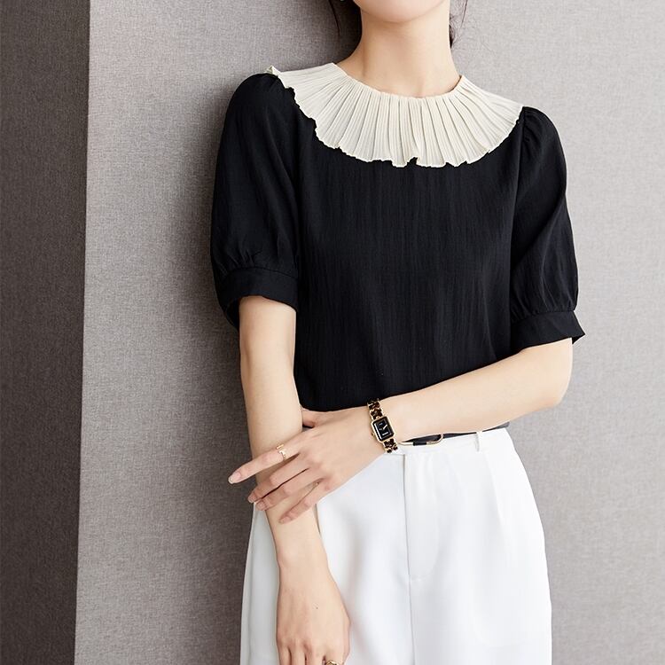トップス ブラウス 半袖 タック パフスリーブ ボリューム袖 プリーツ 襟コンシャス かわいい 大人可愛い シンプル カジュアル きれいめ おしゃれ お洒落 上品 清楚 ナチュラル 涼しげ 春 夏 無地 レディース 女性用 女の子 学生 通学 デート お出かけ 公園デビュー 女子会 休日 普段使い 着回し 合わせやすい ファッション コーデ スタイル ブラック S M L XL