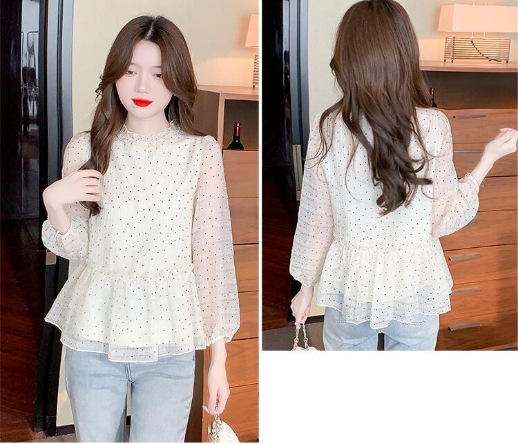 ブラウス トップス シャツ 袖あり スタンドカラー シャーリング 格子柄 ドット フリル ペプラム フレア パフスリーブ シースルー 透け感 シフォン 長袖 かわいい 大人可愛い きれいめ シンプル カジュアル 大人 上品 おしゃれ お洒落 主役級 存在感 春 秋 10代 20代 30代 レディース 女性用 OL 学生 デート お出かけ 公園デビュー 女子会 休日 イベント 旅行 着回し 普段使い コーデ 楽ちん モテ インスタ映え アプリコット S M L XL 2XL