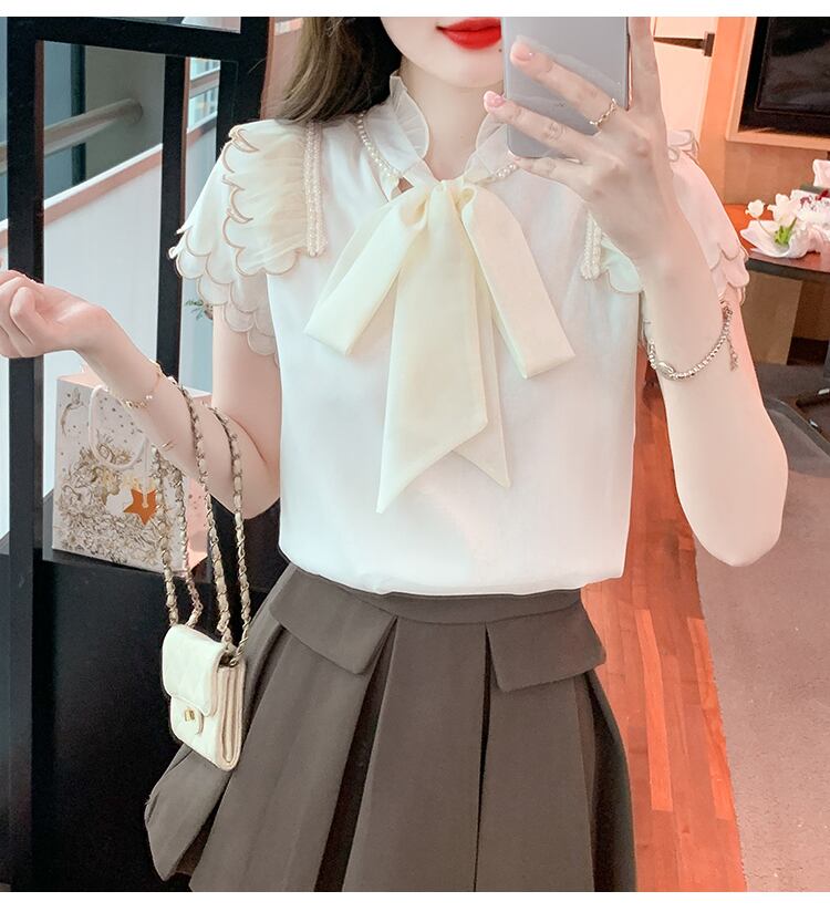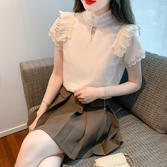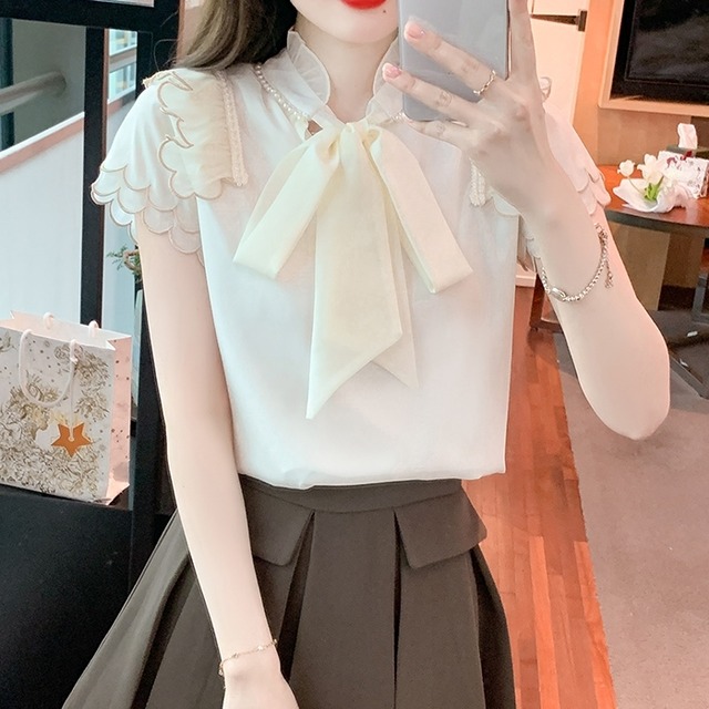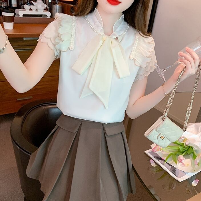 トップス ブラウス スタンドカラー ボウタイ リボン パール シフォン 2WAY パイピング フリル メッシュ チュール 花柄 透け感 半袖 シースルー タック パフスリーブ ボリューム袖 かわいい 大人可愛い シンプル カジュアル きれいめ おしゃれ お洒落 上品 清楚 ナチュラル 涼しげ 春 夏 無地 レディース 女性用 女の子 学生 通学 デート お出かけ 公園デビュー 女子会 休日 普段使い 着回し 合わせやすい ファッション コーデ スタイル ホワイト S M L XL 2XL