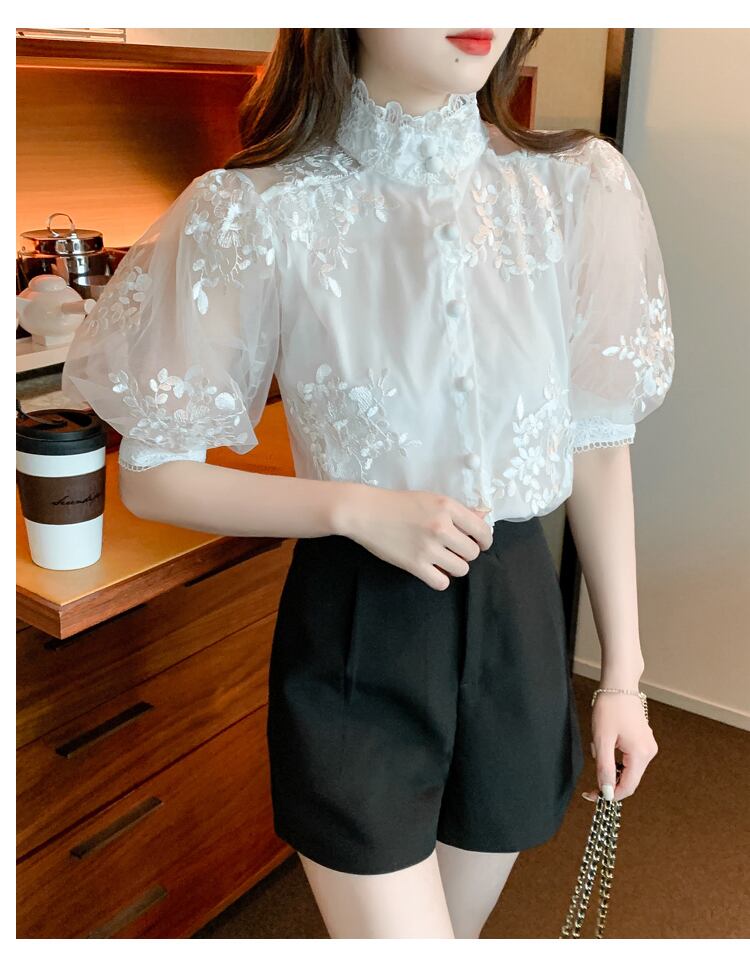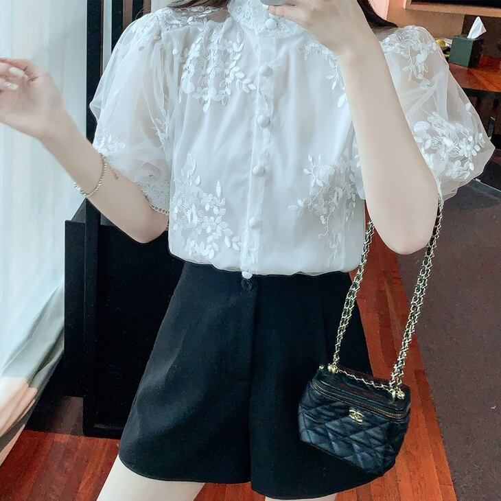 トップス ブラウス スタンドカラー 刺繍 レース 透け感 チュール お花 メッシュ 透け感 半袖 シースルー タック パフスリーブ ボリューム袖 かわいい 大人可愛い シンプル カジュアル きれいめ おしゃれ お洒落 上品 清楚 ナチュラル 涼しげ 春 夏 無地 レディース 女性用 女の子 学生 通学 デート お出かけ 公園デビュー 女子会 休日 普段使い 着回し 合わせやすい ファッション コーデ スタイル ホワイト S M L XL 2XL