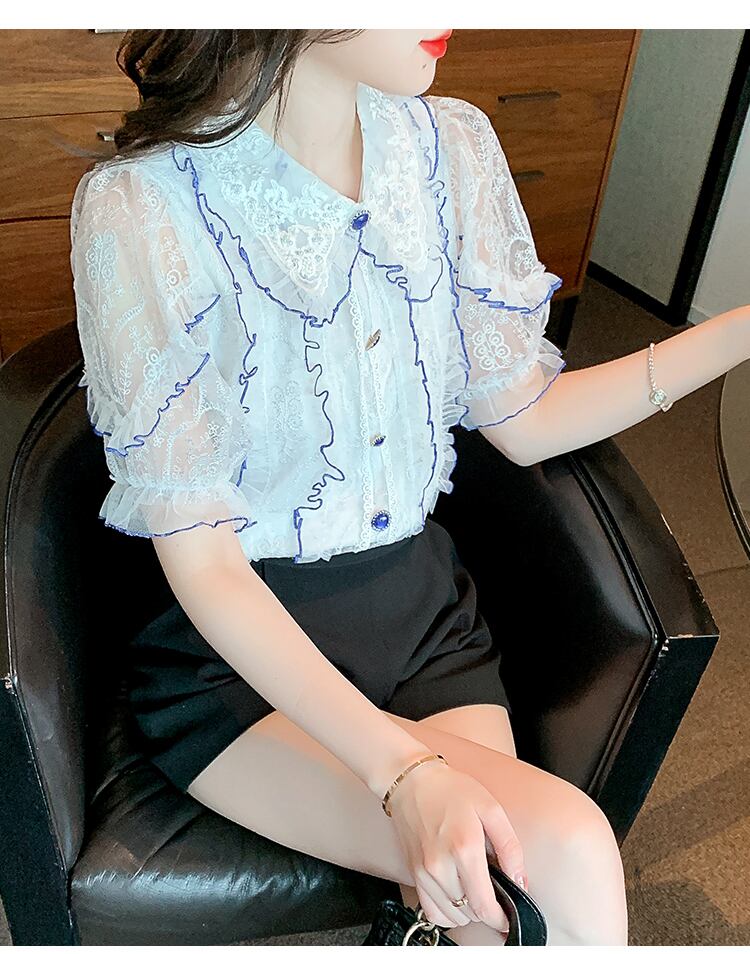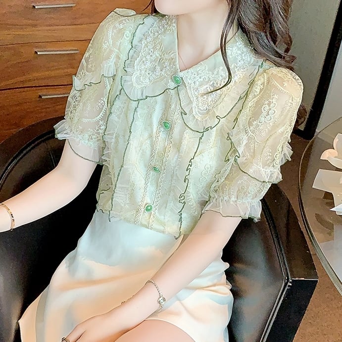 トップス ブラウス レギュラーカラー レース 刺繍 ラインストーン ビジュー モチーフ 半袖 シースルー タック パフスリーブ ボリューム袖 かわいい 大人可愛い シンプル カジュアル きれいめ おしゃれ お洒落 上品 清楚 ナチュラル 涼しげ 春 夏 無地 レディース 女性用 女の子 学生 通学 デート お出かけ 公園デビュー 女子会 休日 普段使い 着回し 合わせやすい ファッション コーデ スタイル グリーン ブルー S M L XL 2XL