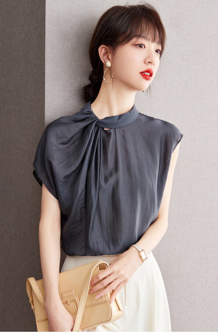 アシンメトリーな襟元のノットでこなれたシルエットに仕立てた上品なブラウストップス。