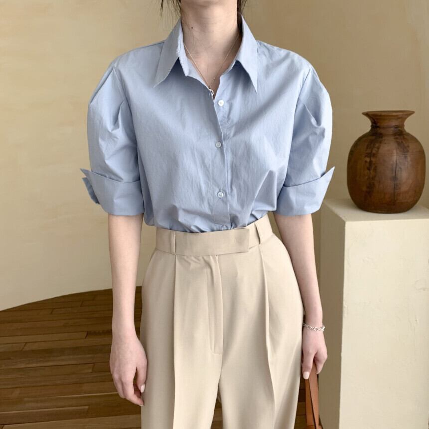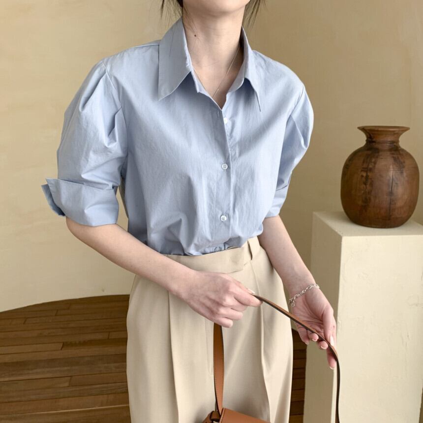 トップス ブラウス レギュラーカラー 半袖 ラック パワーショルダー ロールアップ ドロップショルダー 前開パフスリーブ ボリューム袖 かわいい 大人可愛い シンプル カジュアル きれいめ おしゃれ お洒落 上品 清楚 ナチュラル 涼しげ 春 夏 無地 レディース 女性用 女の子 学生 通学 デート お出かけ 公園デビュー 女子会 休日 普段使い 着回し 合わせやすい ファッション コーデ スタイル S M L XL ライトブルー ホワイト