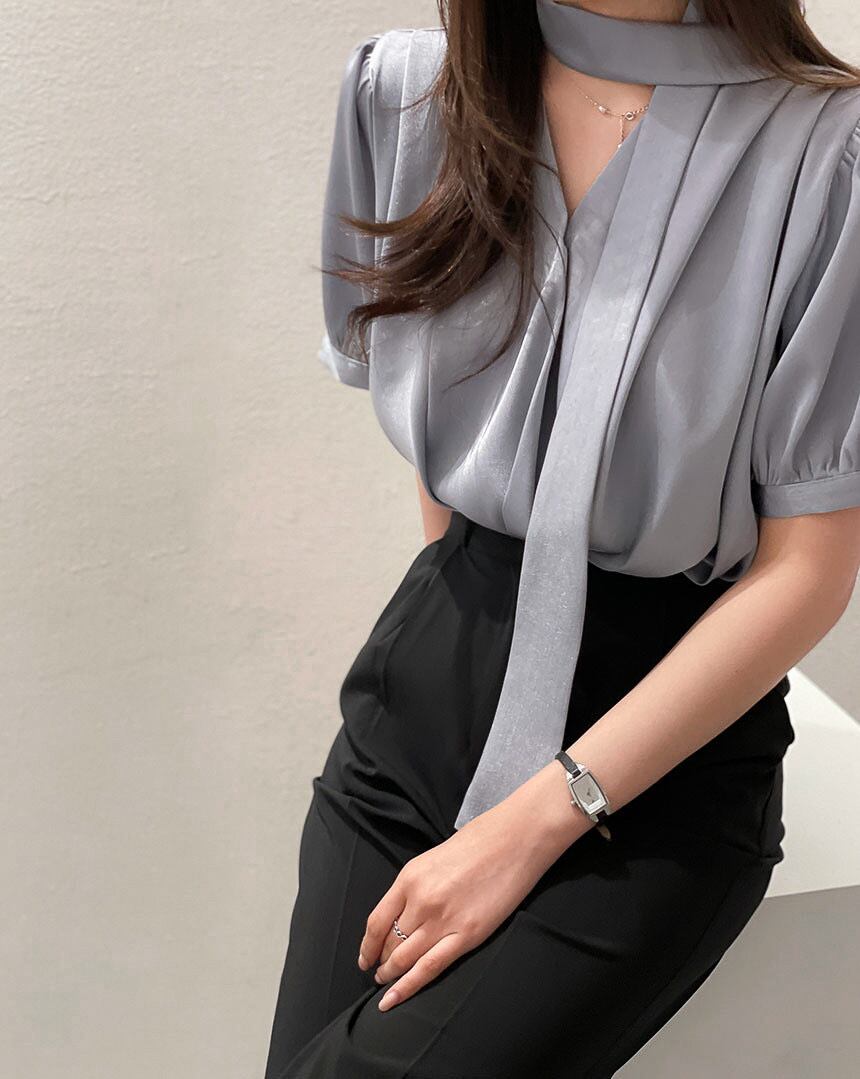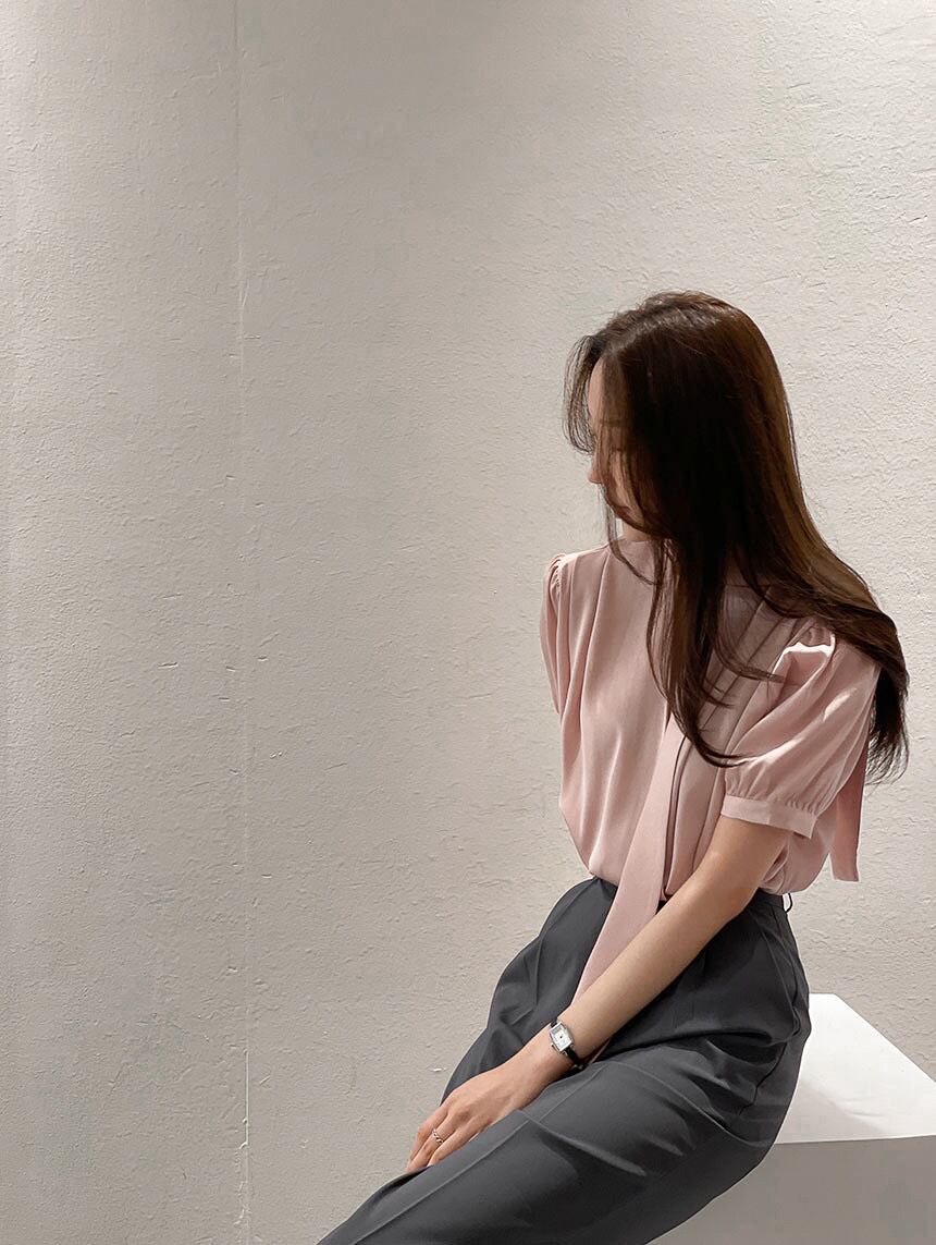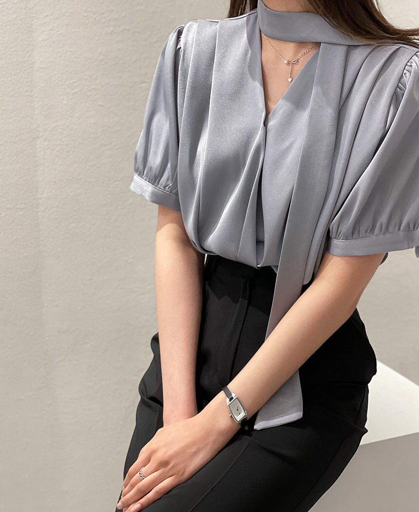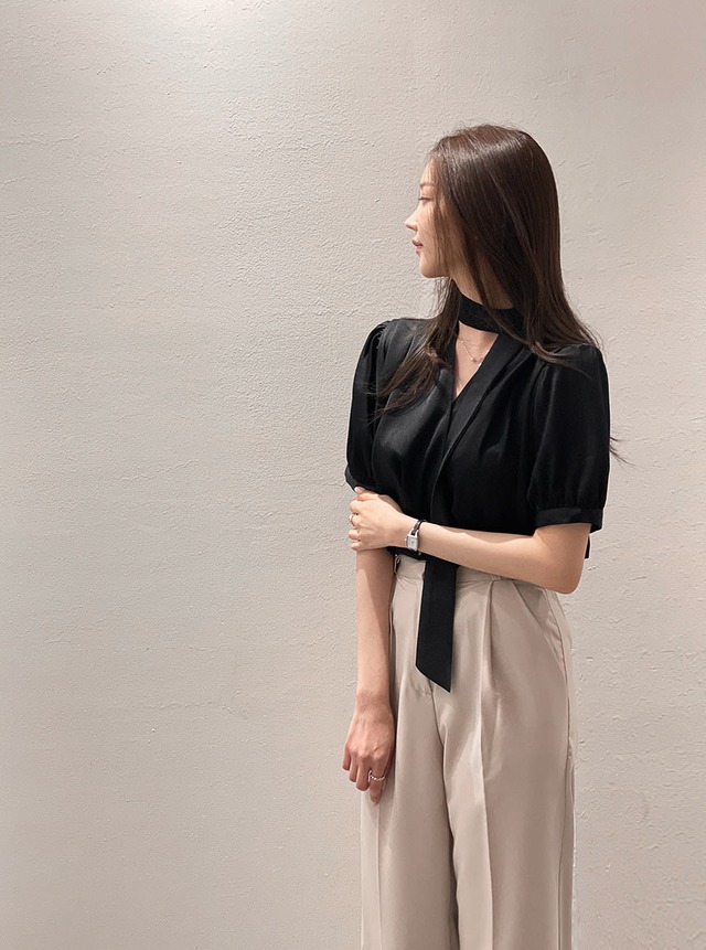首元のリボン装飾と三角に切り取ったようなカットアウトデザインがおしゃれなブラウス。