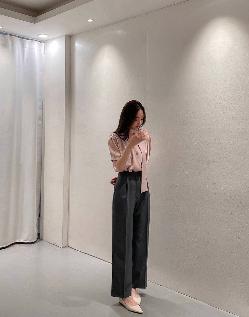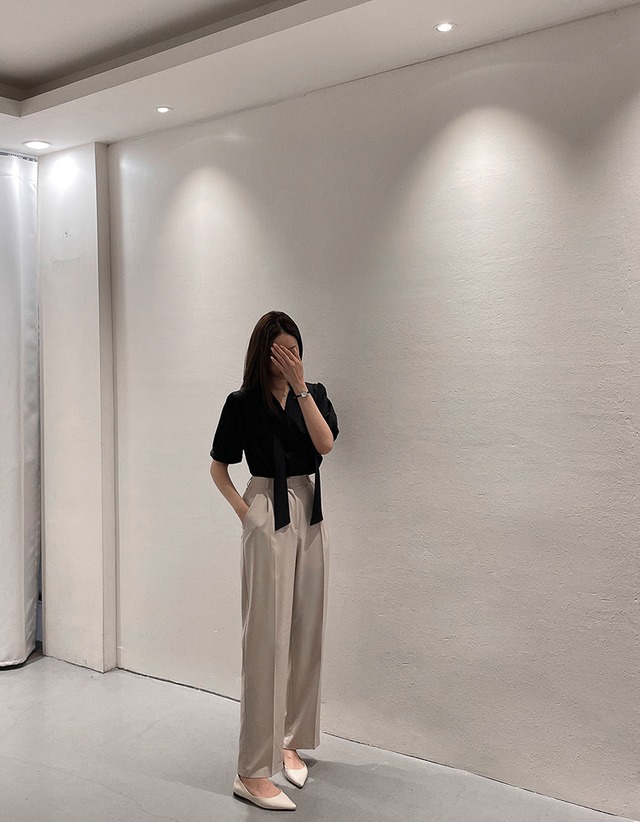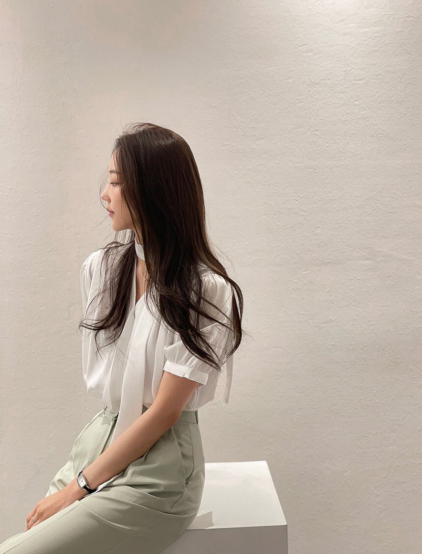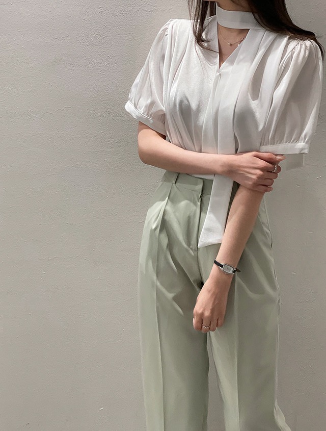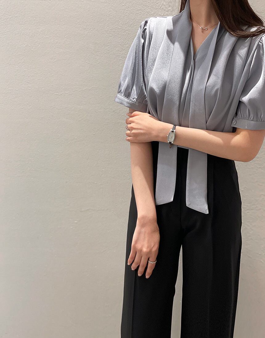 首元のリボン装飾と三角に切り取ったようなカットアウトデザインがおしゃれなブラウス。