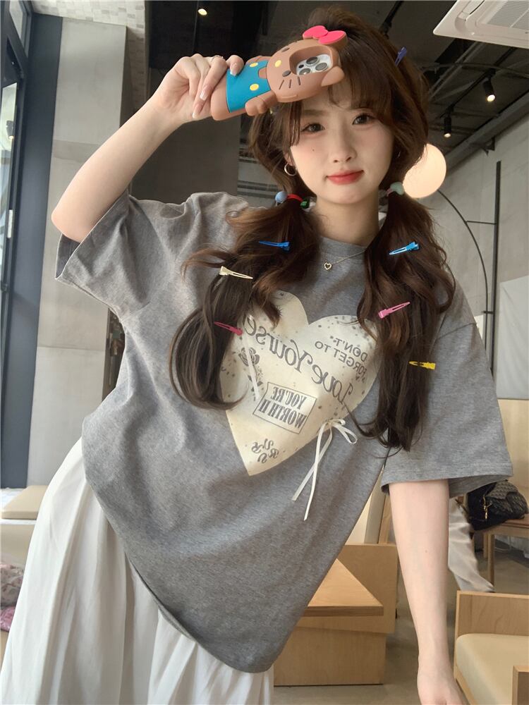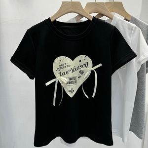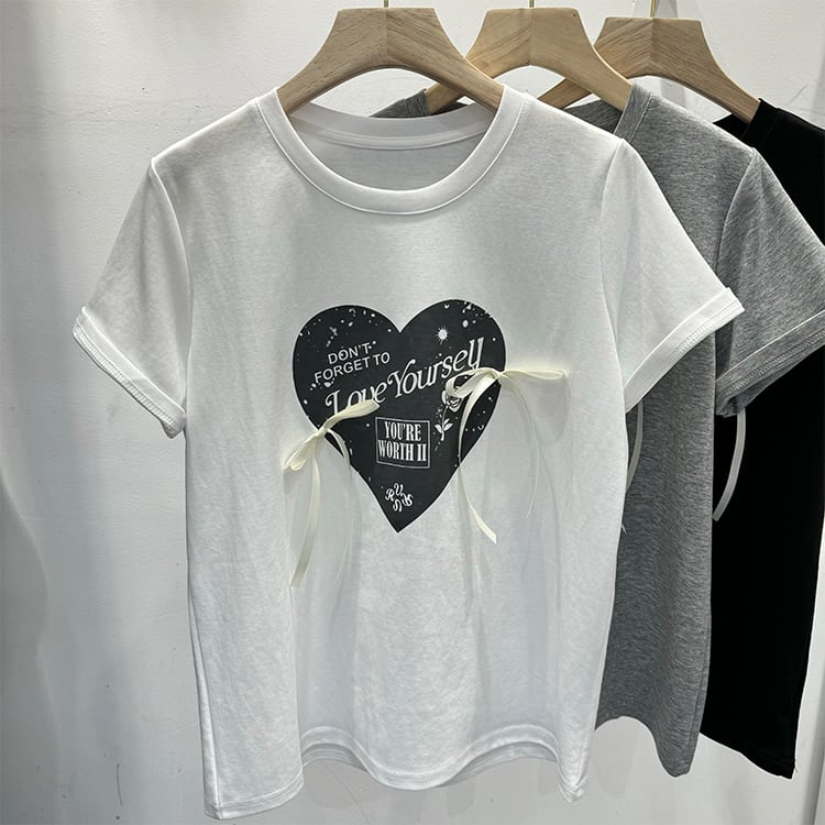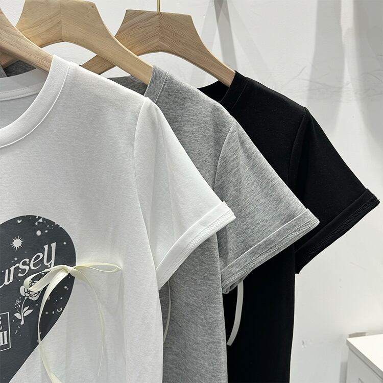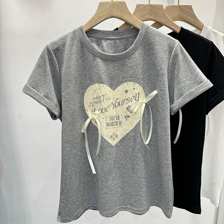 ビッグプリントに添えた華奢なリボンが可愛いデザインの半袖カットソー。