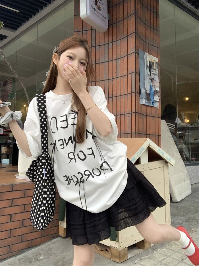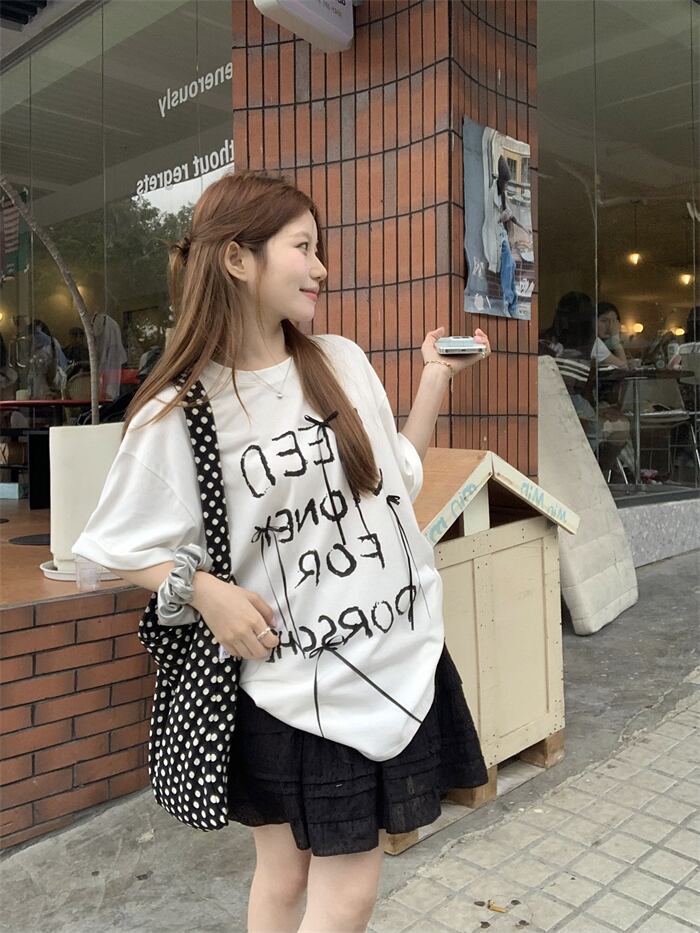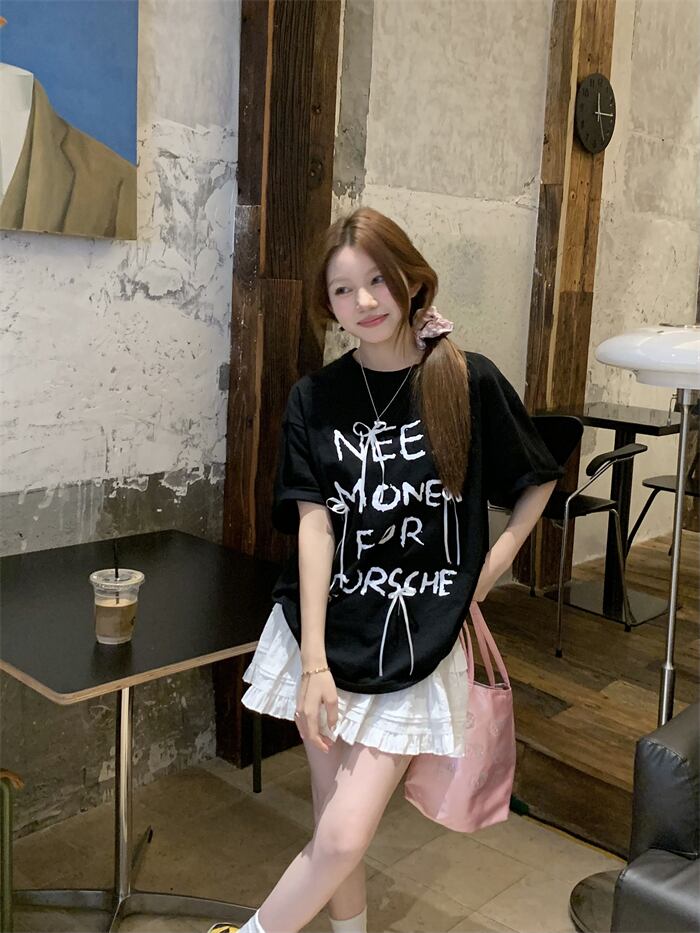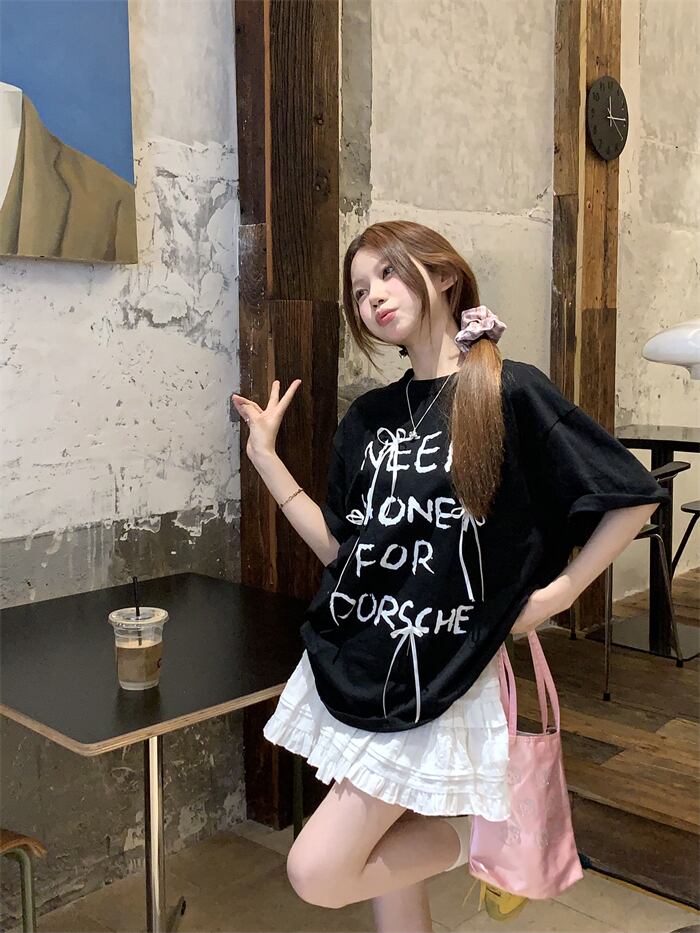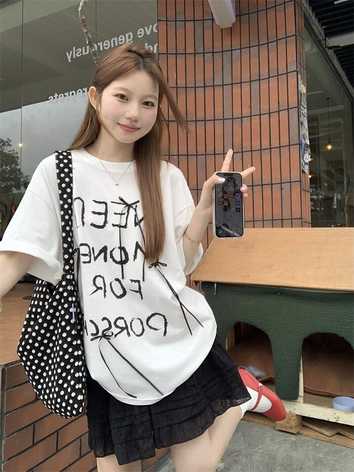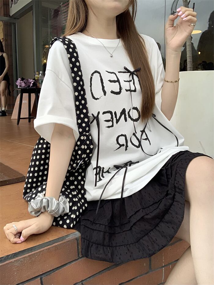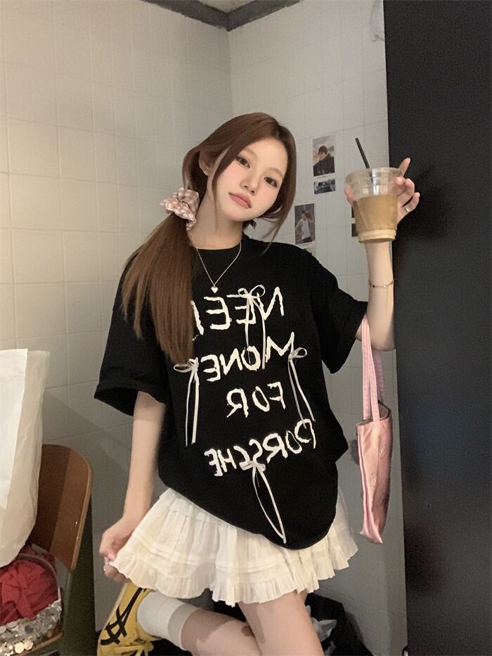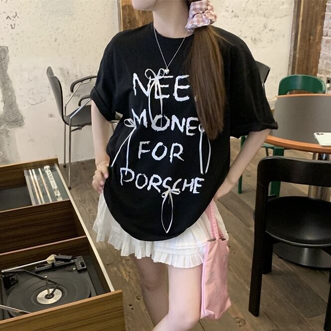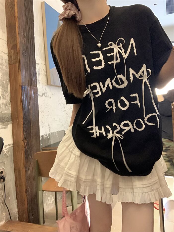 トップス Tシャツ カットソー 袖あり 半袖 オーバーサイズ リボン クルーネック ロゴ レタリング プリント ストレート 伸縮性 きれいめ シンプル カジュアル クラシカル 大人 おしゃれ お洒落 大人可愛い 大人女子 こなれ感 無地 春 夏 10代 20代 30代 40代 レディース 女性用 オフィス OL 通勤 学生 通学 デート お出かけ お泊まり 休日 アウトドア 旅行 着回し 普段使い ワンサイズ ブラック ホワイト