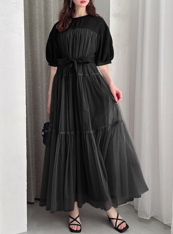 ワンピース 膝下 ロング丈 半袖 ティアード リボン クルーネック パフスリーブ 切り替え ドッキング シャツワンピ Aライン ドレス ワンピースドレス 袖あり Aライン 細身 チュール かわいい 大人 おしゃれ お洒落 大人可愛い エレガント 花柄 10代 20代 30代 レディース 女性用 デート お出かけ 女子会 誕生日 海 ビーチ インスタ映え 春 夏 秋 冬 1.5次会 パーティ 撮影 オフホワイト グレー ブラック ワンサイズ