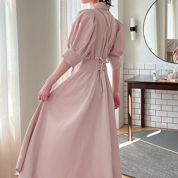 ふんわりパフスリーブとハイウエストのレースアップでスタイルアップ効果あり。