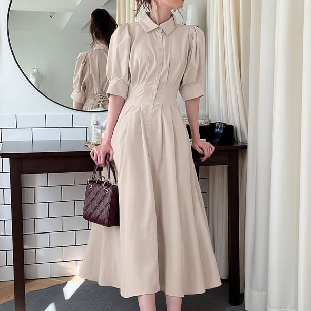タックやシャーリングでメリハリのあるシルエットに仕立てたシャツワンピースです。