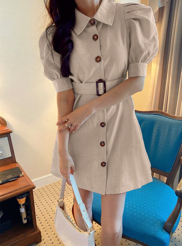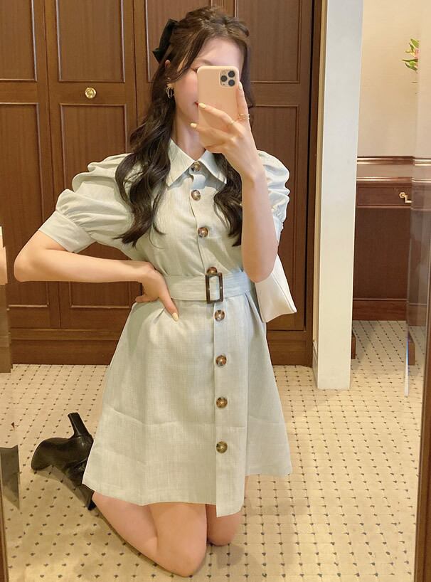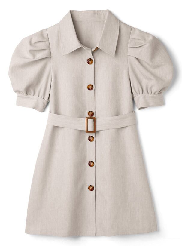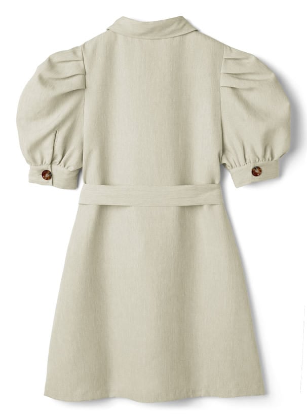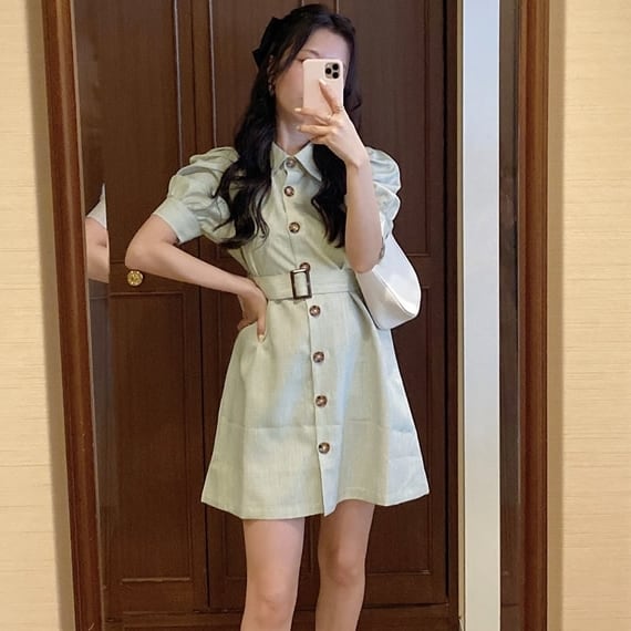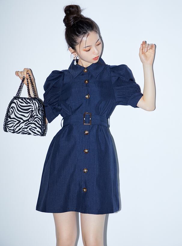 ふんわりパフスリーブとハイウエスト太めベルトでスタイルアップ効果に期待できます。