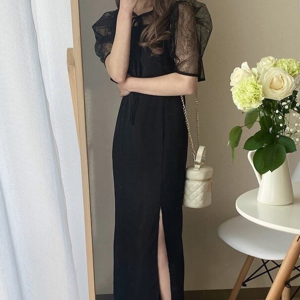 メッシュボレロ付きのシンプルキャミソールワンピースです。
