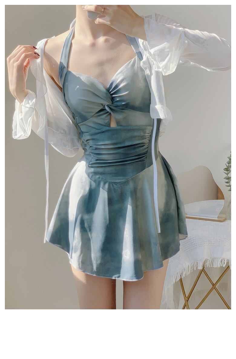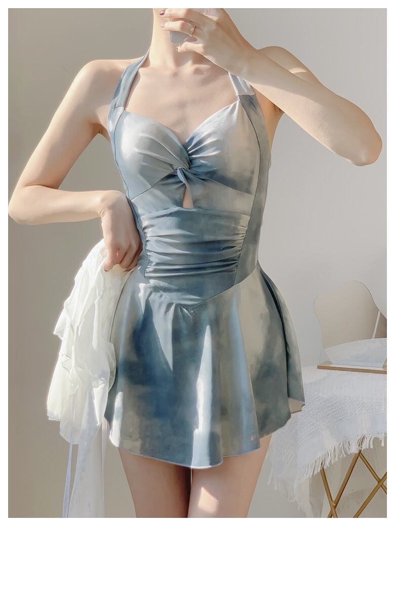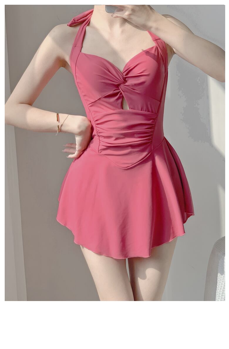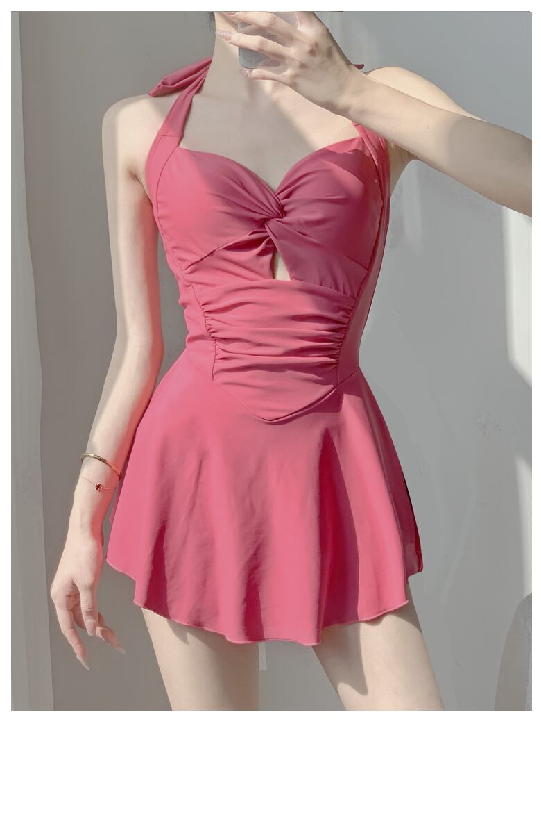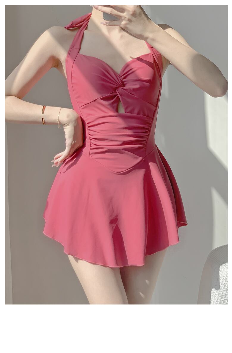 ウエスト周りのシャーリングやカットアウトがさり気なく可愛いオールインワンの露出控えめなワンピース水着です。