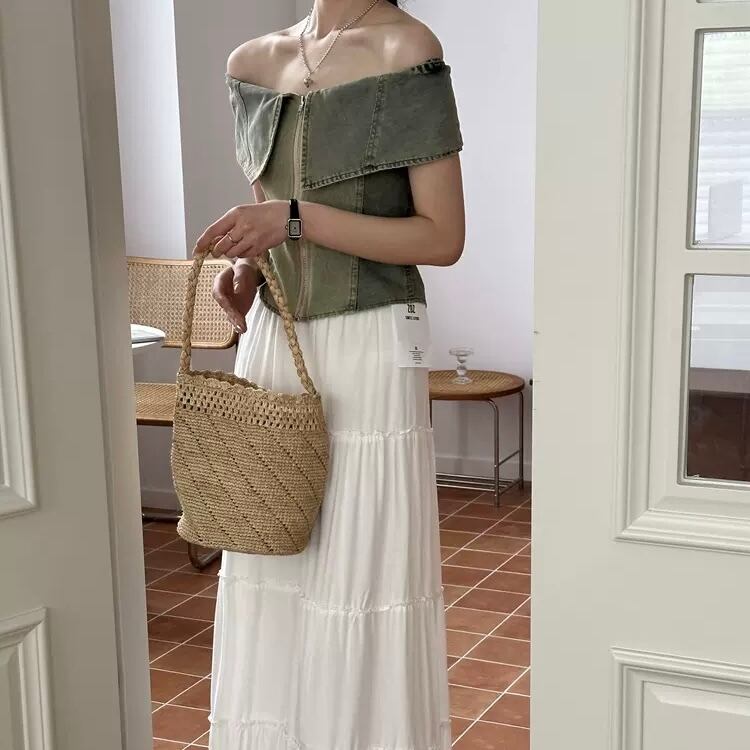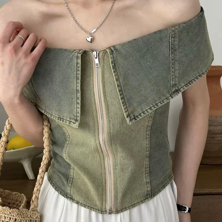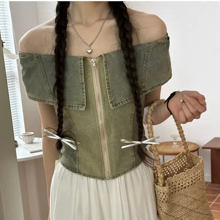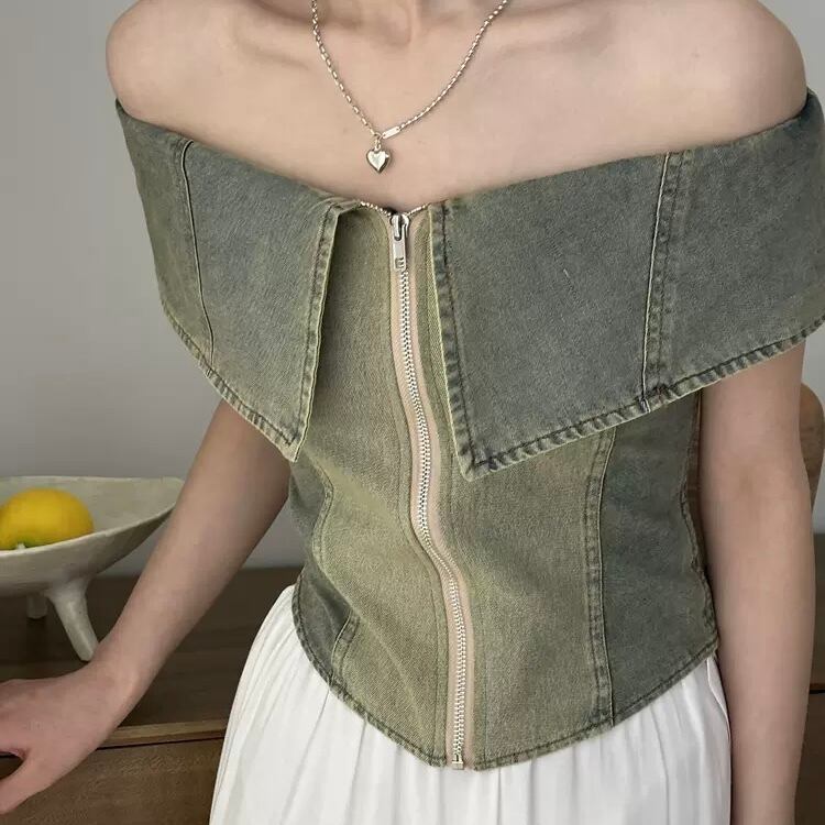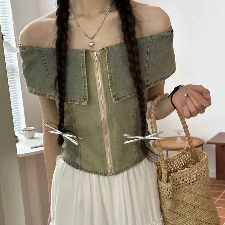 トップス トレンド 韓国風 デニム オルチャン ヘソ出し オフショルダー オフショル デコルテ 肩出し 肌見せ ミディアム丈 ジッパー チャック デザイントップス 女っぽ ストレート 細身 ウエスト 大人可愛い きれいめ シンプル カジュアル 大人カジュアル 大人 上品 おしゃれ お洒落 かっこいい 大人女子 こなれ感 ラフ クール セクシー 無地 春 夏 秋 S M デート お出かけ 女子会 休日 リゾート 旅行 着回し 普段使い 韓国 韓国系 大人カラー モテ 美デコルテ 大人カラー カーキ 緑
