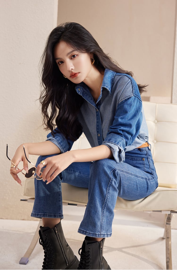 ツートーンデニムや変形のポケットがコーデのさりげないアクセントになります。
