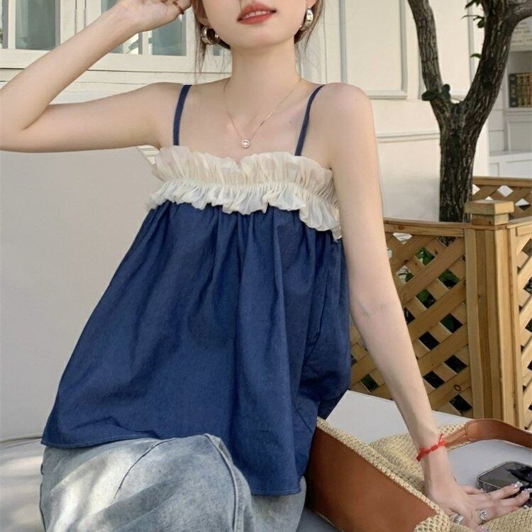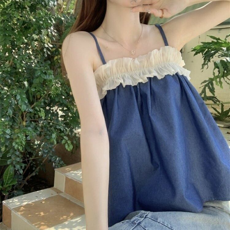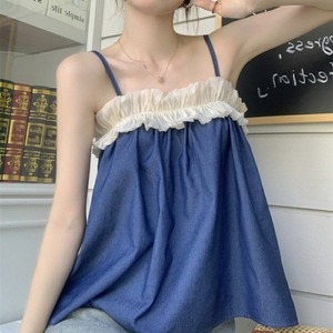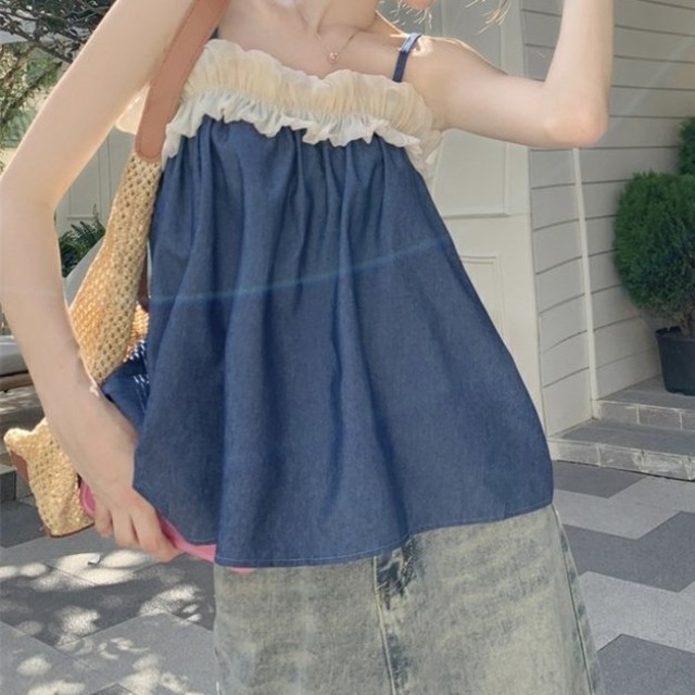 華奢な肩紐とデコルテのふんわり感がこなれたデニムキャミソールトップスです。