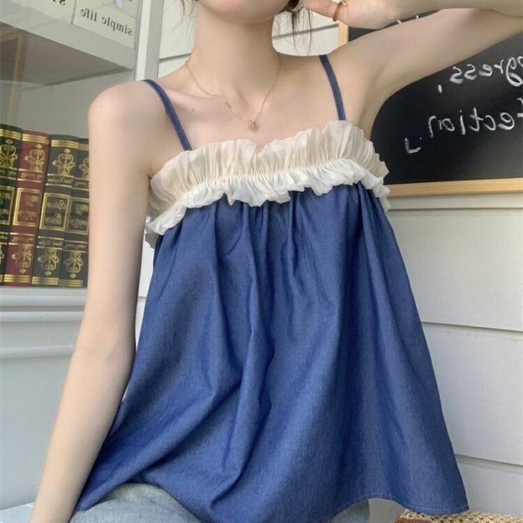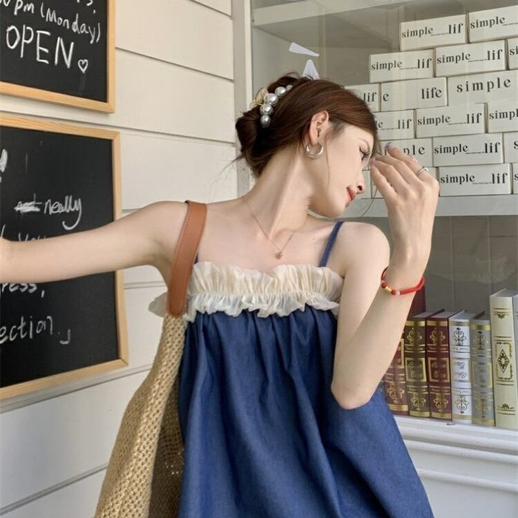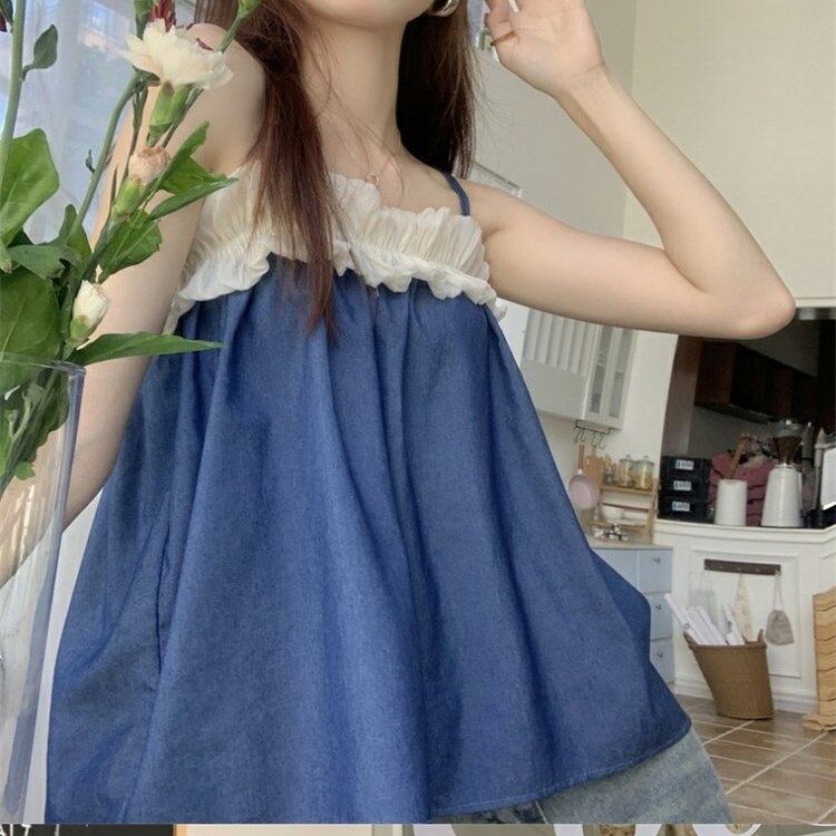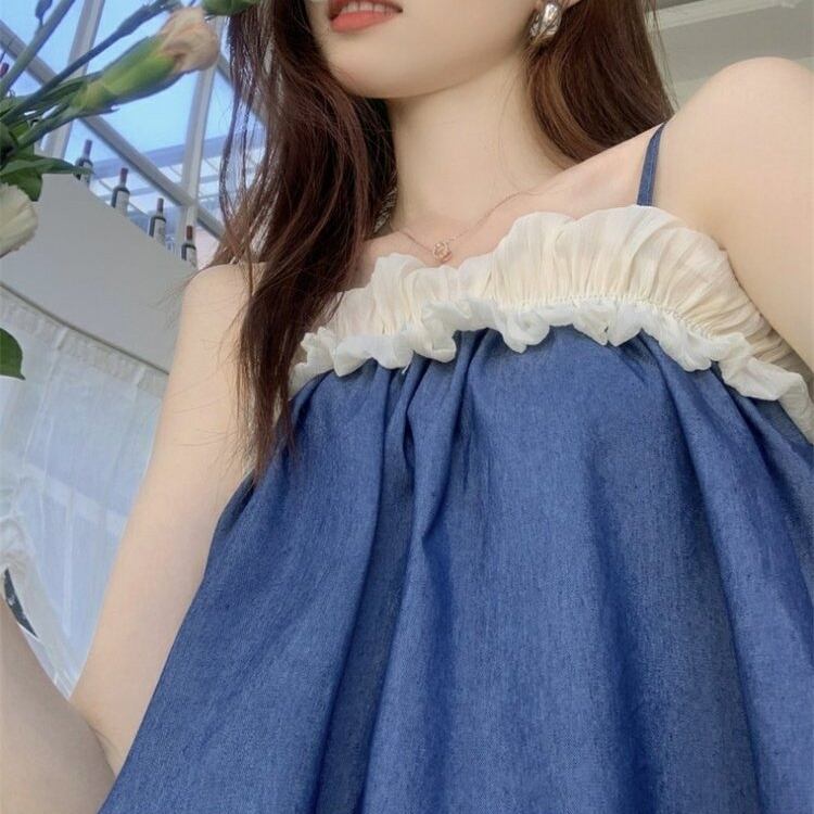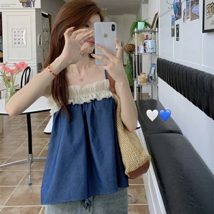 ビスチェ トップス キャミソール フリル ショート丈 フレア リボン ペプラム デニム スリット ショート丈 ノースリーブ かわいい 大人可愛い シンプル カジュアル きれいめ おしゃれ お洒落 キュート 存在感 春 夏 レディース ママ 女の子 学生 通学 デート お出かけ 女子会 休日 普段使い 韓国風 オルチャン 脚長 S M L XL ブルー