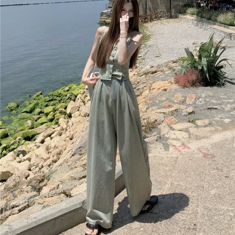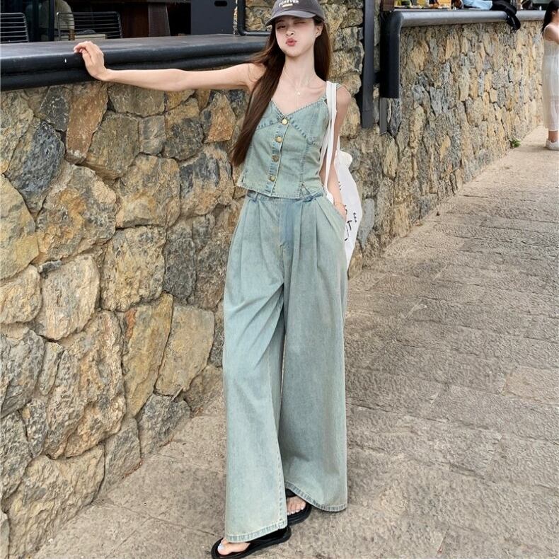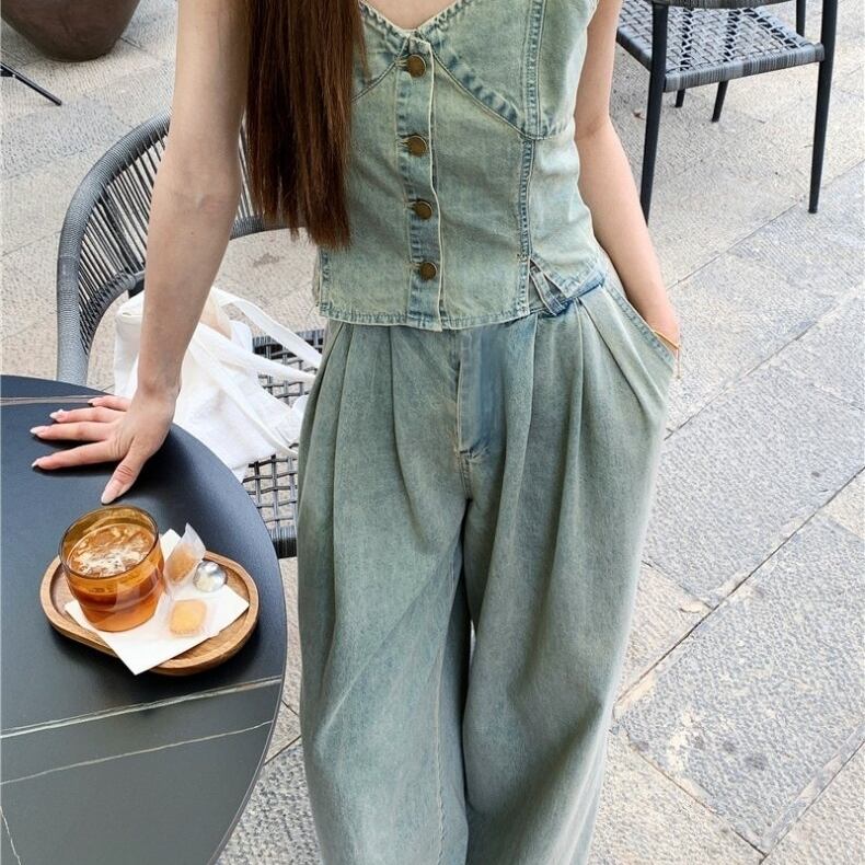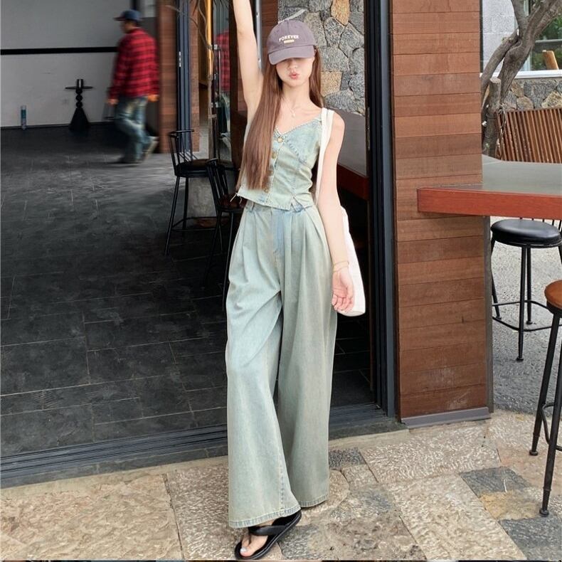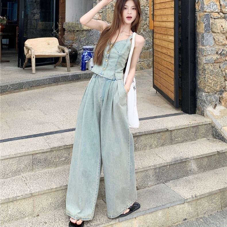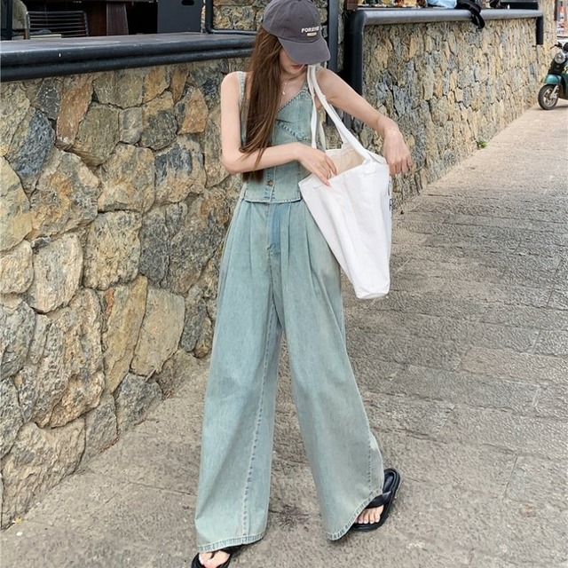 セットアップ デニム ベスト キャミソール ジャケット ノースリーブ 前開き クロップド タック ワイドパンツ ボトム トップス フロントボタン 切り替えデザイン ロング丈 Aライン ウエストゴム かわいい 大人可愛い シンプル カジュアル きれいめ 上品 おしゃれ こなれ感 キュート 個性的 存在感 春 夏 無地 学生 通学 デート お出かけ 女子会 普段使い 休日 韓国風 オルチャン ファッション コーデ 脚長 S M L ブルー