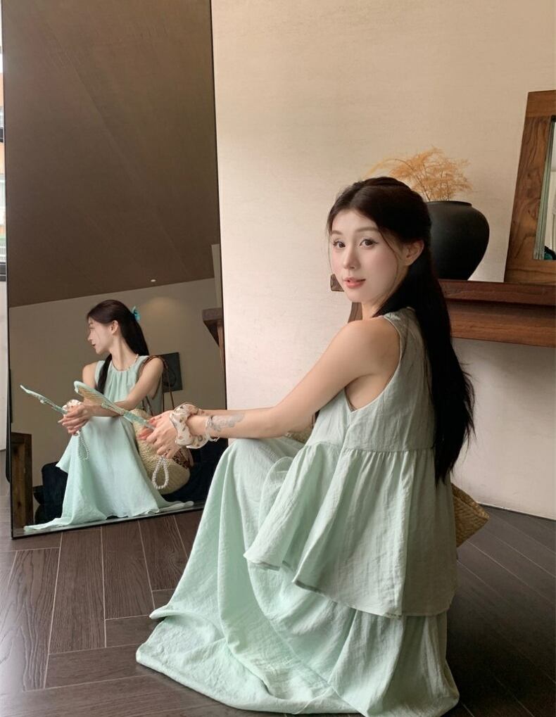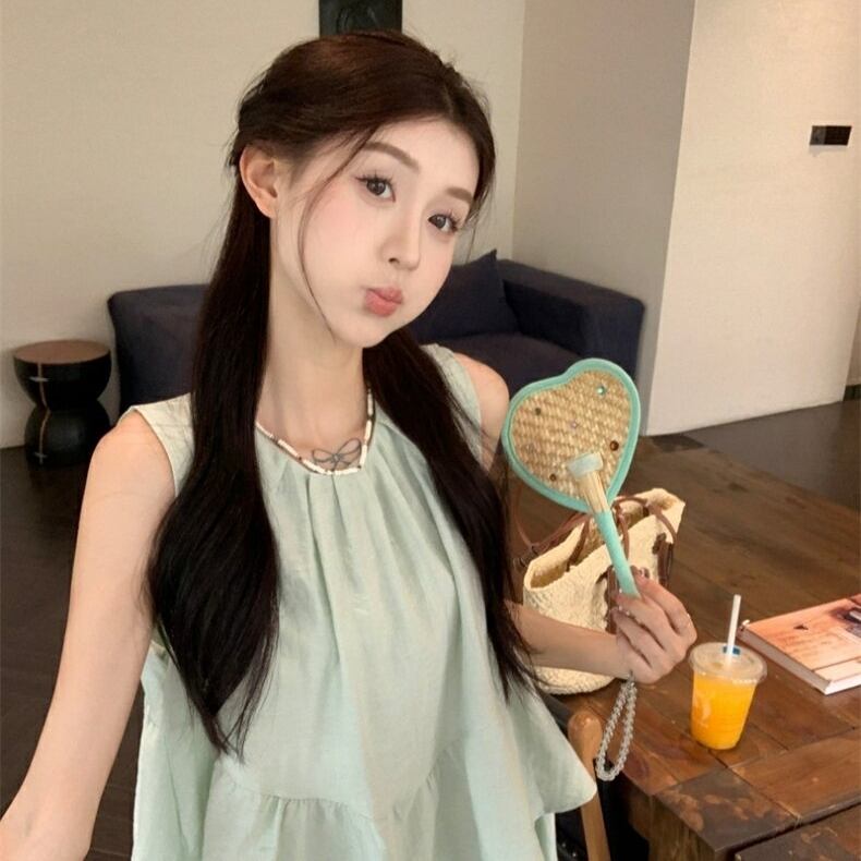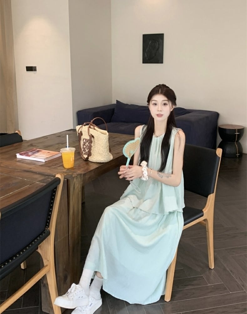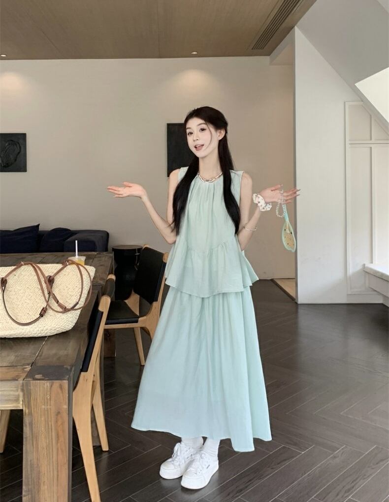 セットアップ ブラウス ノースリーブ フレアスカート クルーネック ペプラム プルオーバー ボトム トップス ドロップショルダー 切り替えデザイン ミモレ丈 Aライン ウエストゴム かわいい 大人可愛い シンプル カジュアル きれいめ 上品 おしゃれ こなれ感 キュート 個性的 存在感 春 夏 無地 学生 通学 デート お出かけ 女子会 普段使い 休日 韓国風 オルチャン ファッション コーデ 脚長 ワンサイズ ブルー