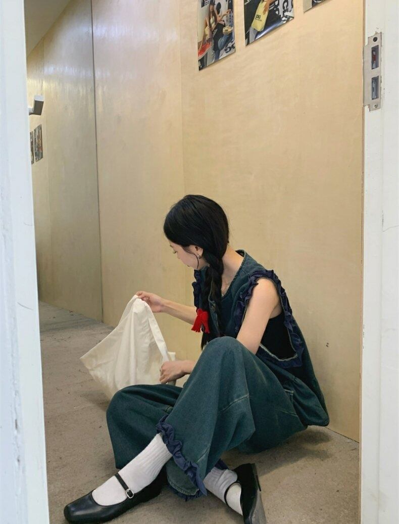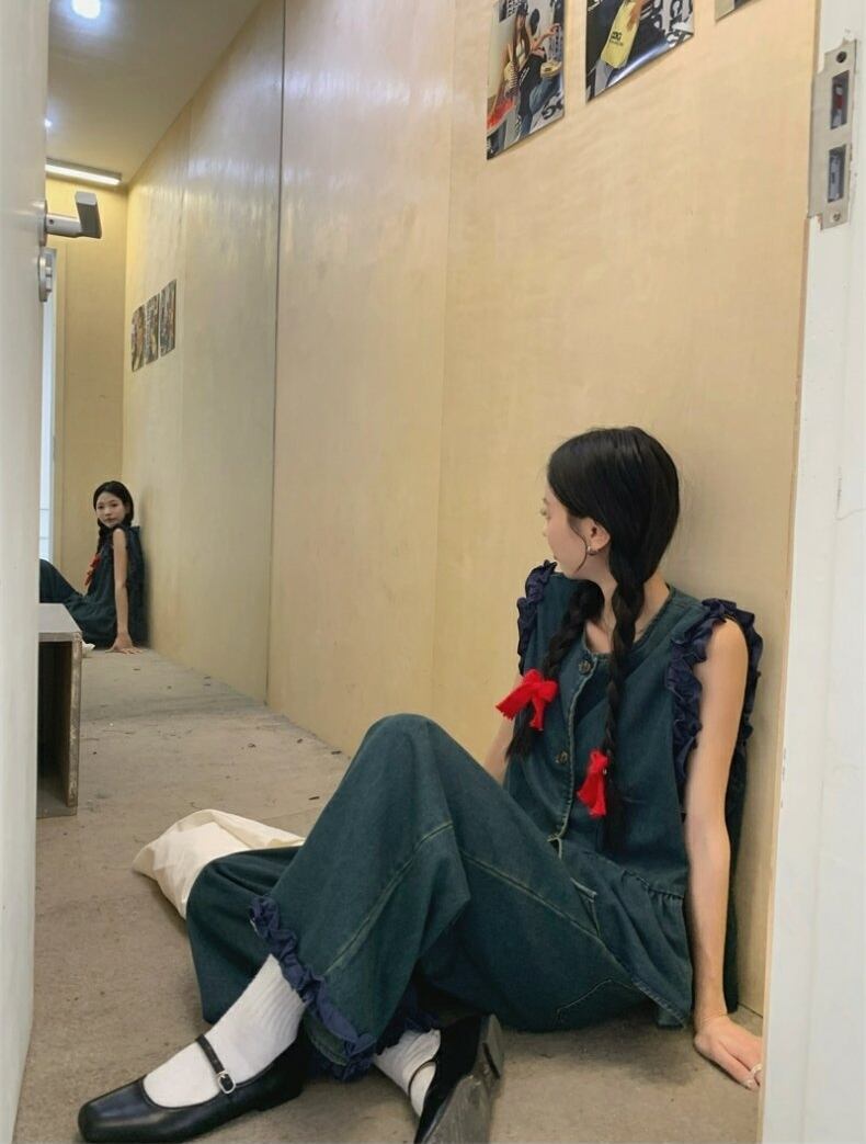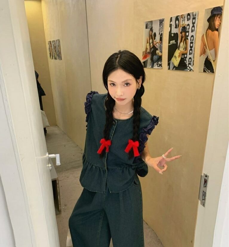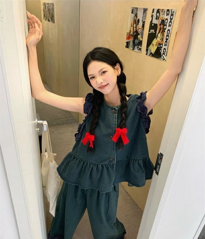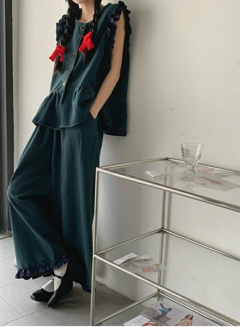 セットアップ デニム ベスト タンクトップ ペプラム ジャケット ノースリーブ 前開き クロップド フリル タック ワイドパンツ ボトム トップス フロントボタン 切り替えデザイン ロング丈 Aライン かわいい 大人可愛い シンプル カジュアル きれいめ 上品 おしゃれ こなれ感 キュート 個性的 存在感 春 夏 無地 学生 通学 デート お出かけ 女子会 普段使い 休日 韓国風 オルチャン ファッション コーデ 脚長 S M L ブルー